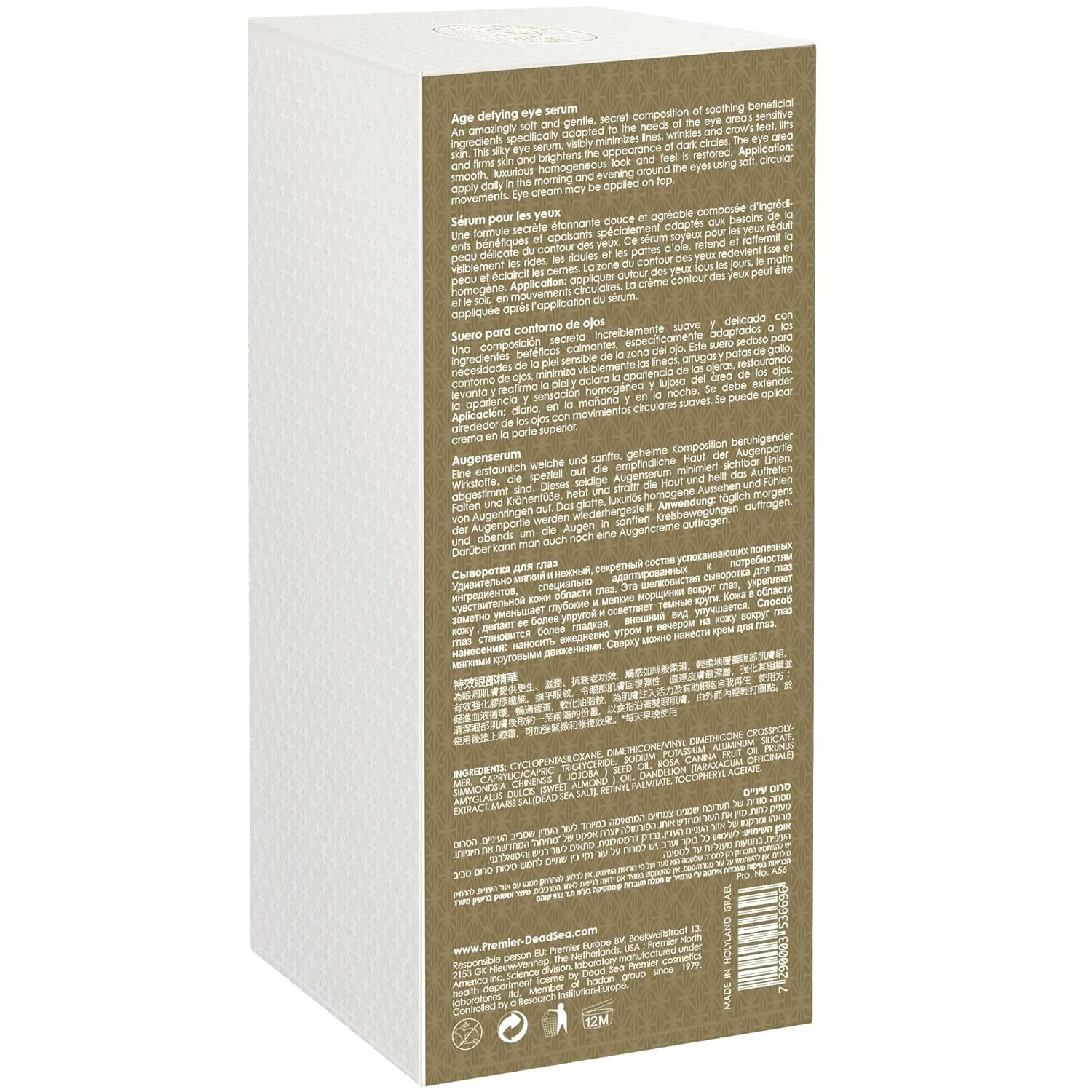 Premier Dead Sea Classic Eye Serum, Hypoallergenic, Age defying, Helps minimize wrinkles, Dark circles, Sagging skin, Reduce bags, with vitamins A & E 1.2 fl.oz
