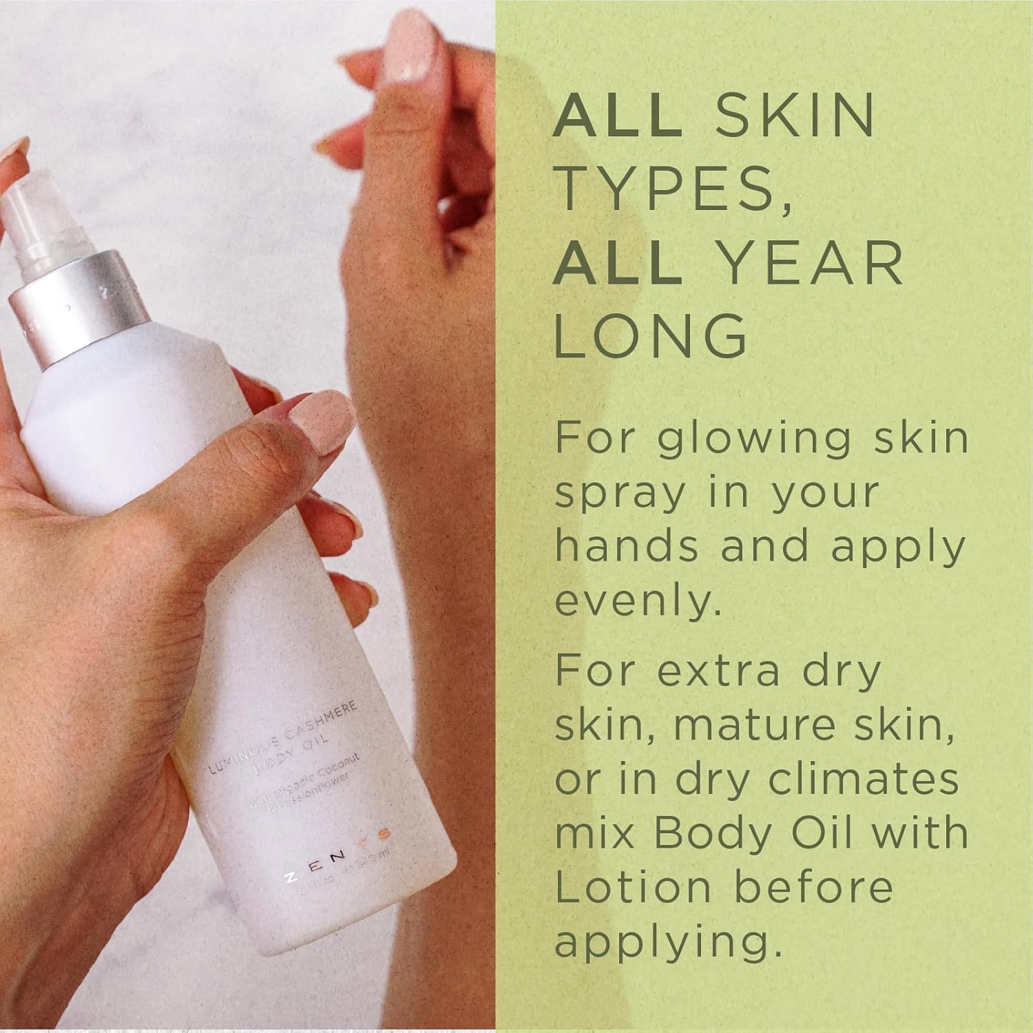 Zents Luminous Cashmere Body Oil (Oolong Fragrance) | Moisturizing Body Oil with Vitamin E & Organic Coconut Oil | Softens & Smooths Skin | 8 fl oz