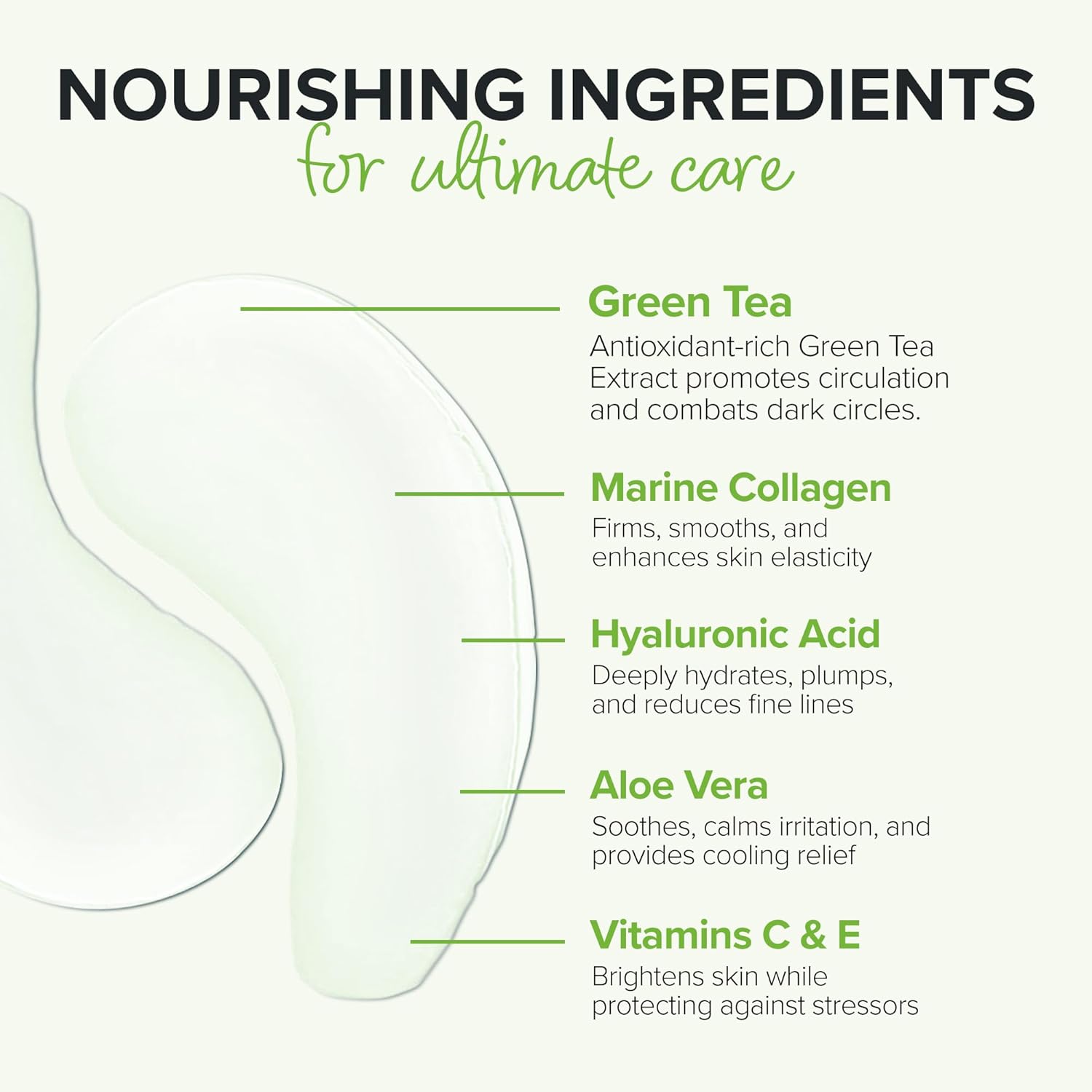 - NUTRIENT PACKED. Green Tea EYES collagen gel masks are micro-infused with a combination of hyaluronic acid, natural high-density marine collagen, enzymes, amino acids, natural marine minerals, trace elements, proteins and vitamins C & E.