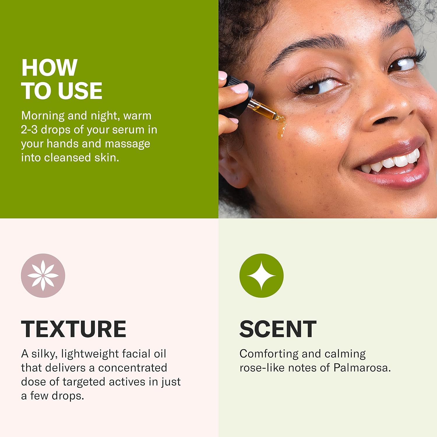 - Application Uses & Tips: For an intensive solution, apply 2-3 drops directly on cleansed skin. Or supercharge your moisturizer and mix in 2-3 drops with your daily dose of crème.