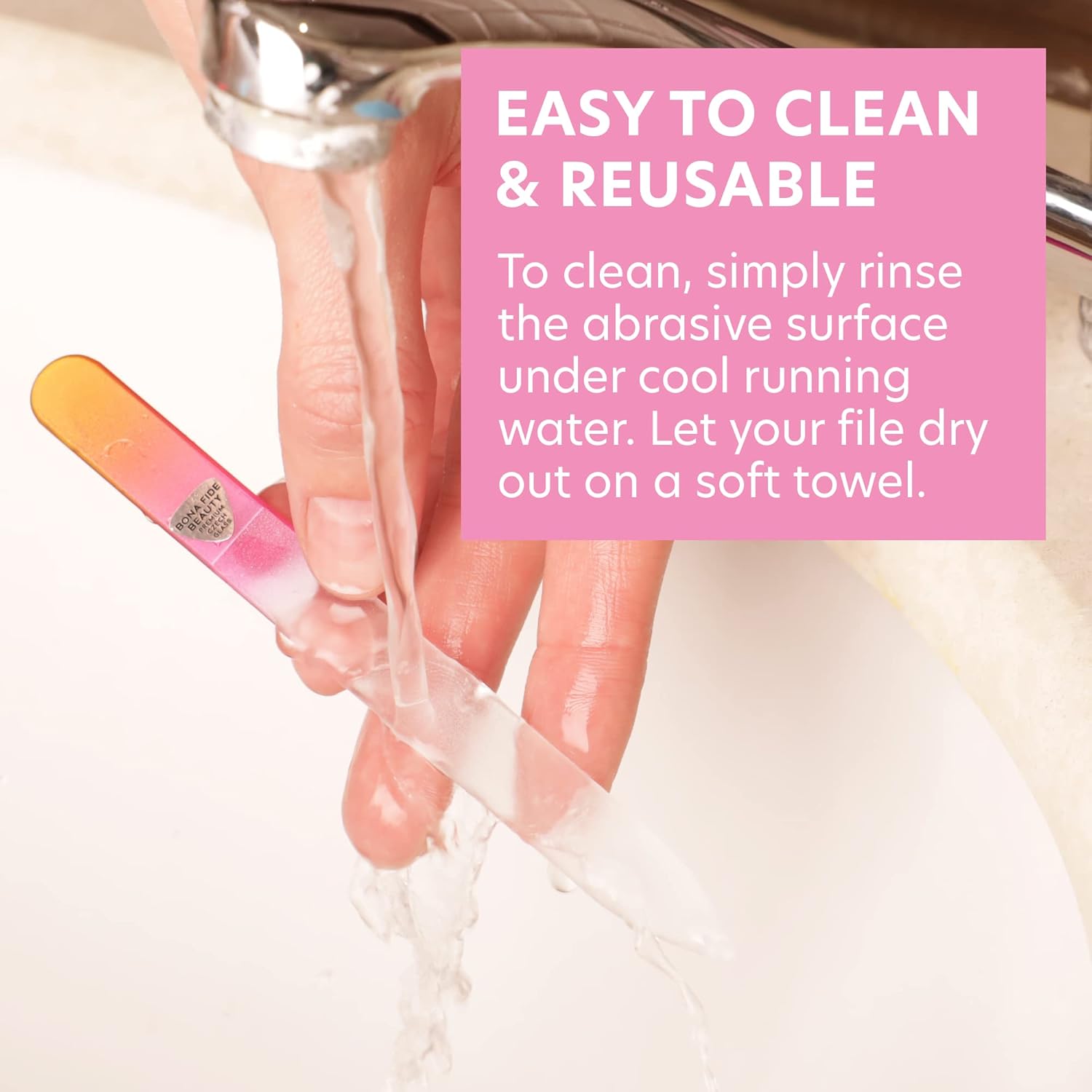 - Easy to Clean - To clean a glass nail filer, rinse it under cool running water to remove nail dust. Apply a small amount of mild soap and optionally use a soft toothbrush to gently scrub the surface. Rinse thoroughly, let it air dry, and once dried, it can be used again.