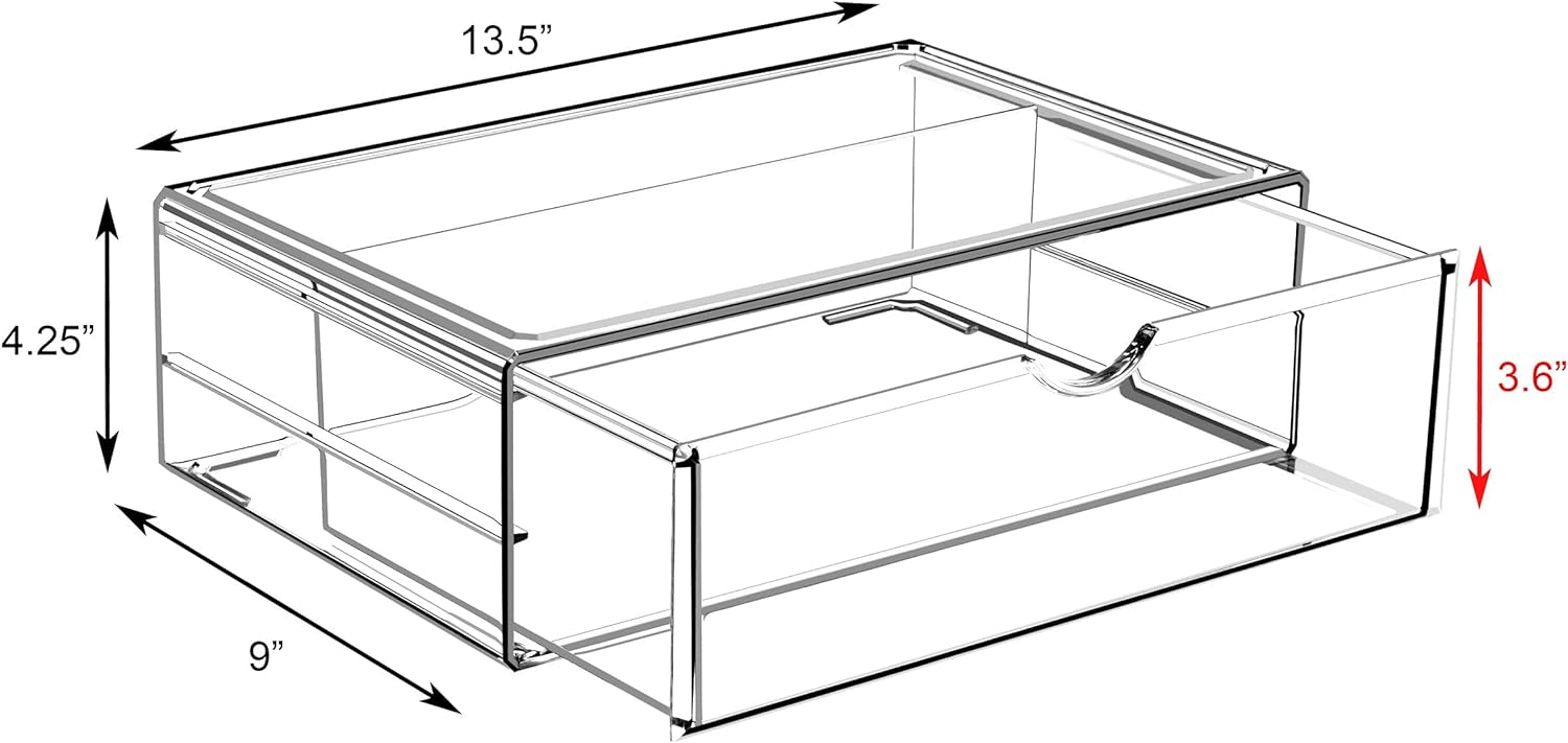 - Design Details: The Sorbus Acrylic Makeup Drawer Organizer helps reduce clutter, gain space, and save time getting ready - Clear drawers slide open smoothly with easy-to-grip scoop handles - Measures approximately 13.5” L x 4.25” H x 8.75” W
