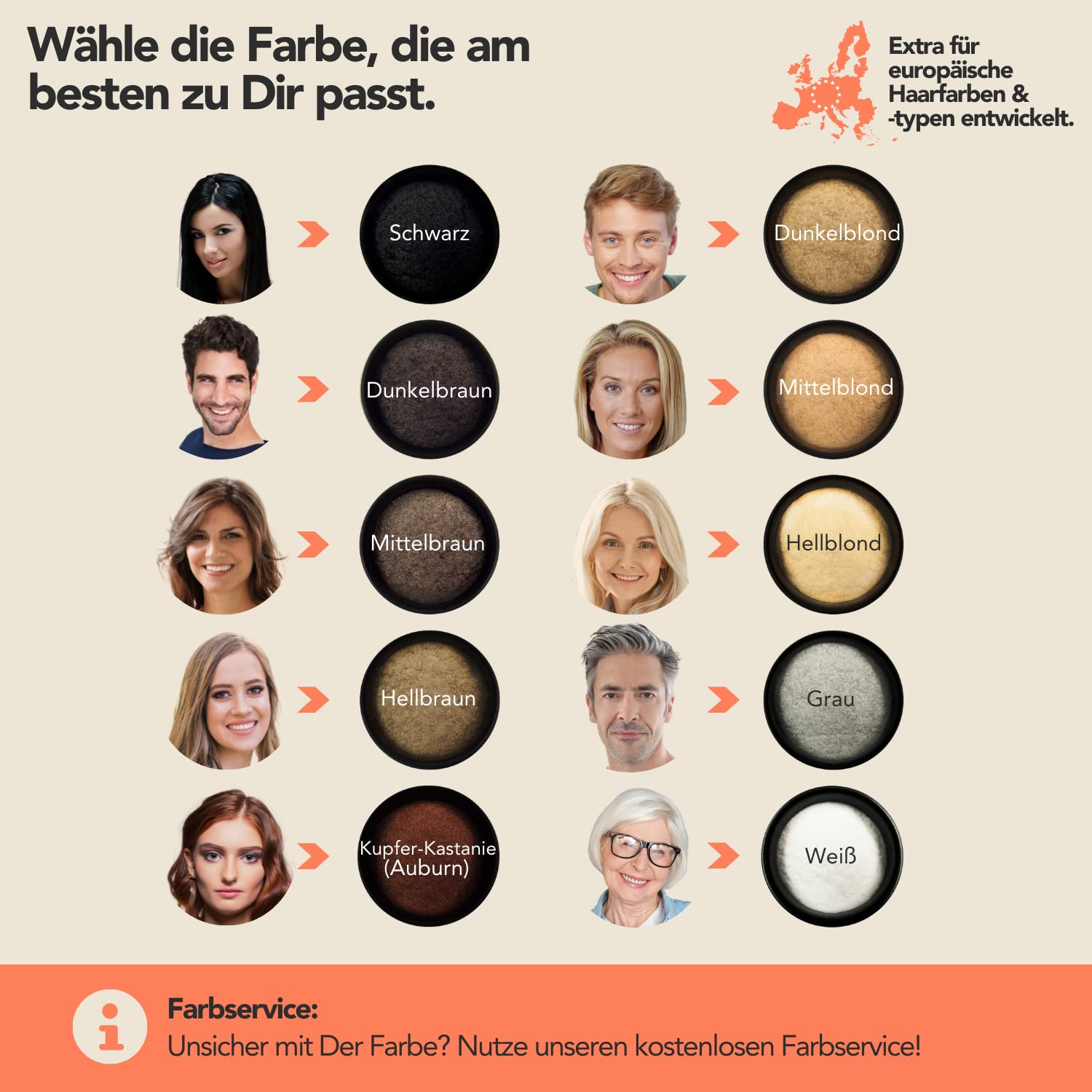 - "PERFECT COLOR CHOICE - Choose your hair color from 9 natural shades. If you are unsure or torn between two colors, opt for the darker one! We are happy to offer you a personal service. Send us a photo via support, and we will tell you which color of the thinning hair cover up you need.