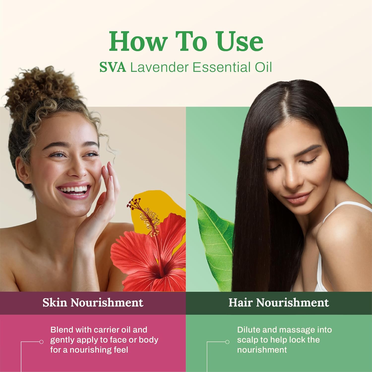 - Haircare: SVA Lavender Oil is widely used for hair and scalp massage. Always dilute with a carrier oil before use since it is highly concentrated. To use Lavender oil for scalp and hair, simply mix a few drops of Lavender oil for hair with your shampoo, conditioner, and mask and use regularly.
