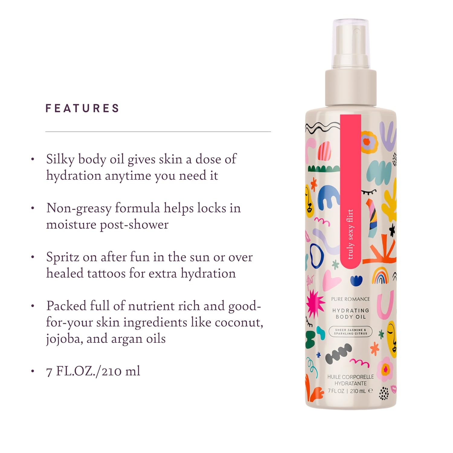 Pure Romance Lustra Hydrating Body Oil - Non-Greasy After Shower Moisturizer for Dry Skin - Infused with Jojoba and Argan Oils - Mist on With Convenient Spray Bottle, 7 Fl Oz, Truly Sexy Flirt