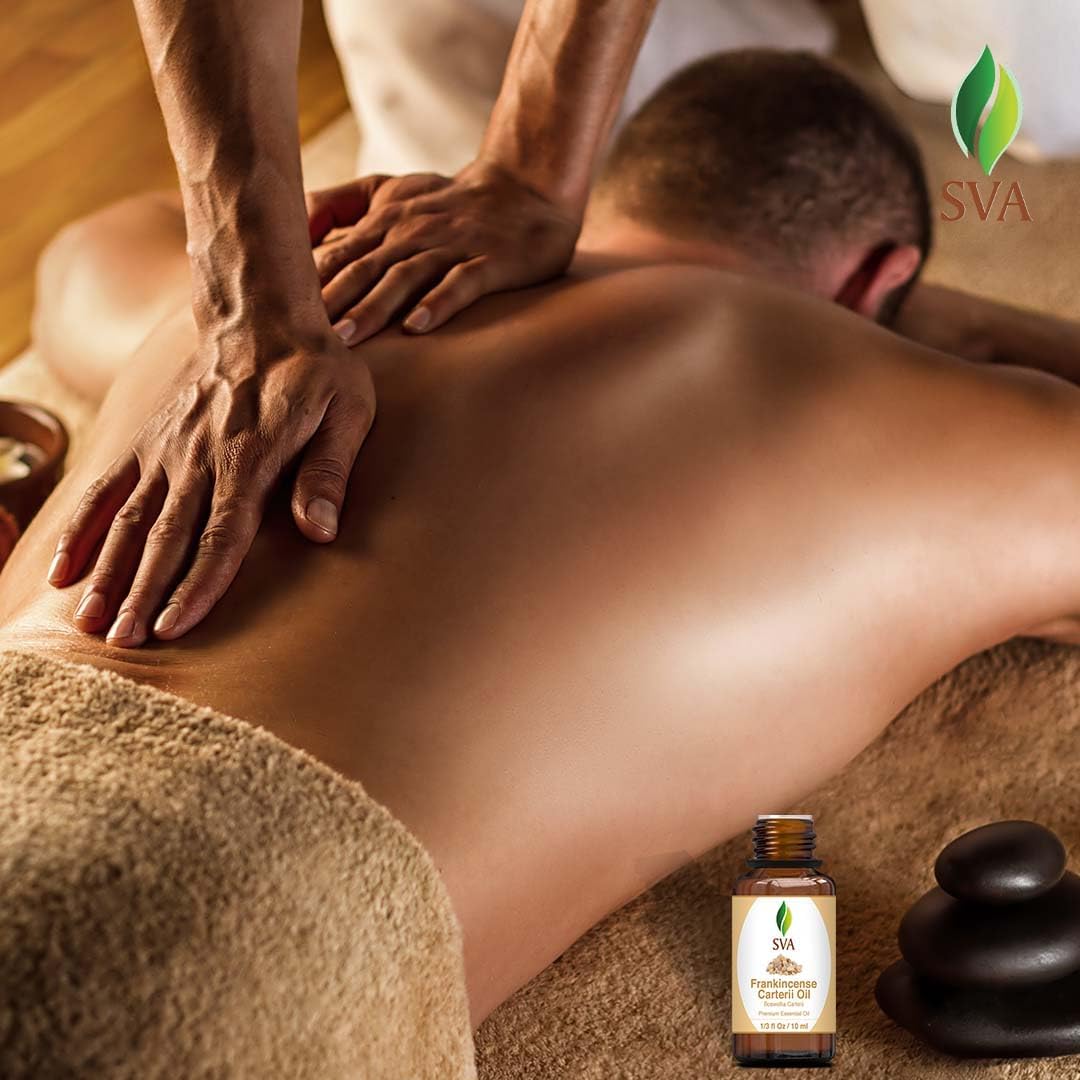 - Skin Nourishment: SVA Frankincense Boswellia Carterii Essential Oil is suitable for massage. It should always be diluted with suitable carrier oil before use since it is highly concentrated. There are many ways to use frankincense essential oil for skin. Add a few drops of the oil to your creams, lotions, or bath products to enjoy the goodness of frankincense oil for your skin