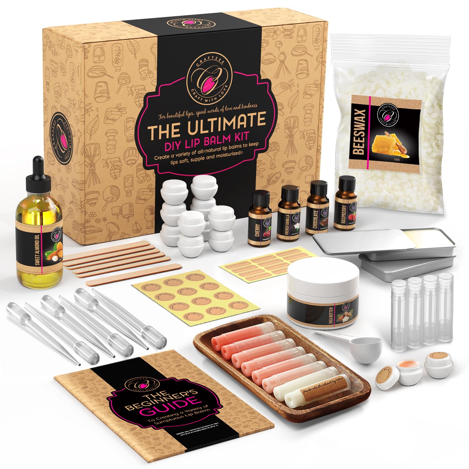 CraftZee Organic Lip Balm Making Kit. DIY Lip Gloss Pack, Natural Beeswax, Shea Butter, Sweet Almond Oil, Essential Oils, Tools, Instruction Manual. Sleepover Party Supplies for Girls, Adult Craft Kit