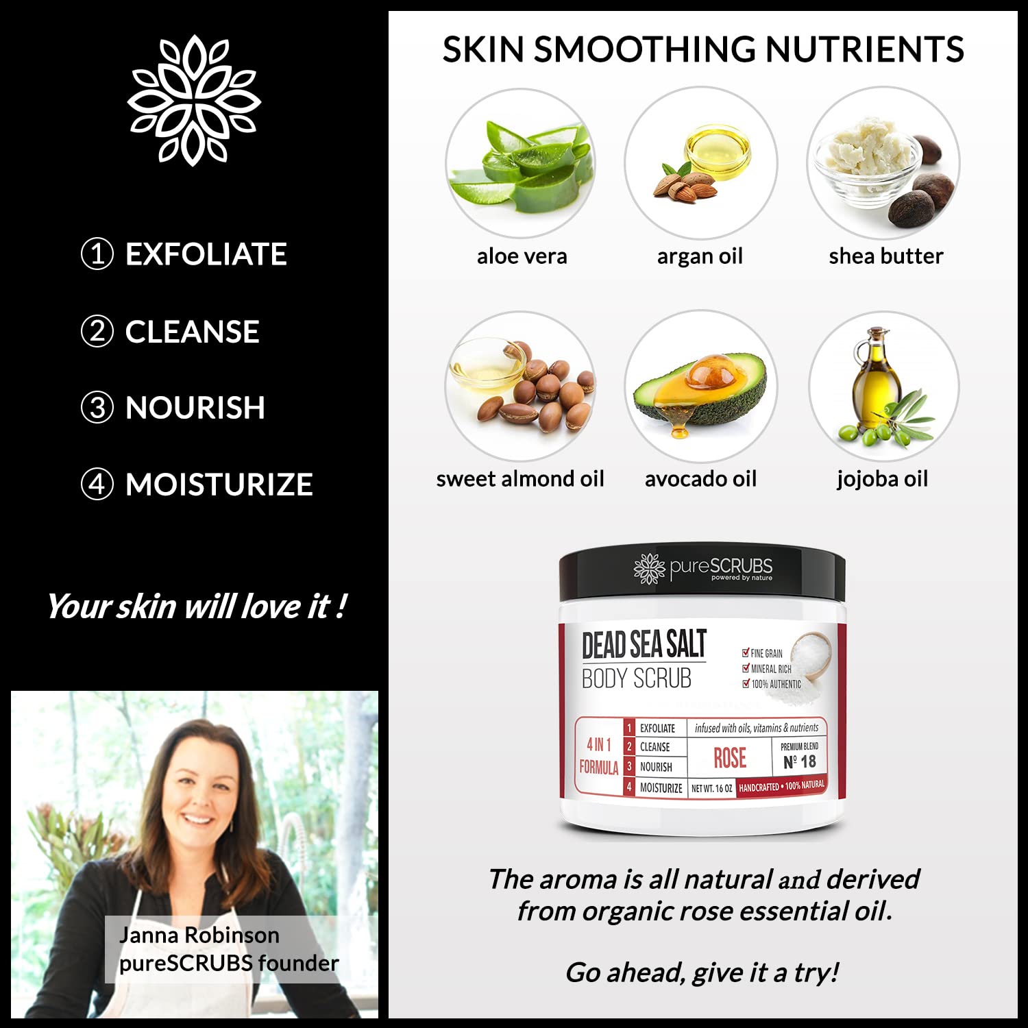 - GET ULTRA SMOOTH SKIN FAST - THIS WORKS! Our unique “4 in 1 Formula” does everything a body scrub should do and more - EXFOLIATE, CLEANSE, NOURISH & MOISTURIZE. Fine grain dead sea salt infused with essential oils, nutrients and skin softeners helps to smooth away rough, bumpy, and uneven textures to instantly reveal your true soft, healthy and radiant skin. You'll love the aroma of fresh roses!