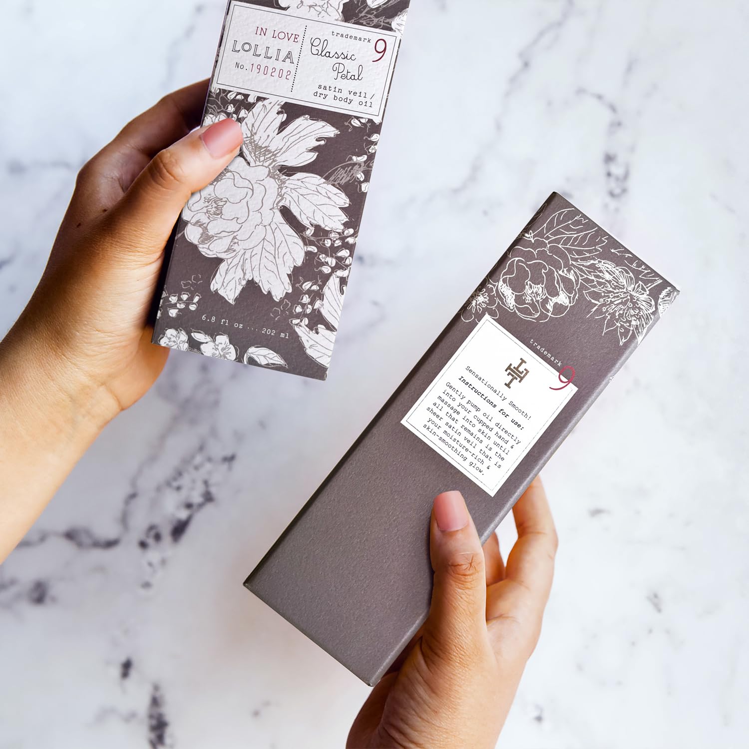 - ELEGANT GLASS BOTTLE: This dry oil for skin comes in a gold kissed glass bottle that nestles in a fine white rose patterned telescoping box of beautiful smoke and earthen slate.