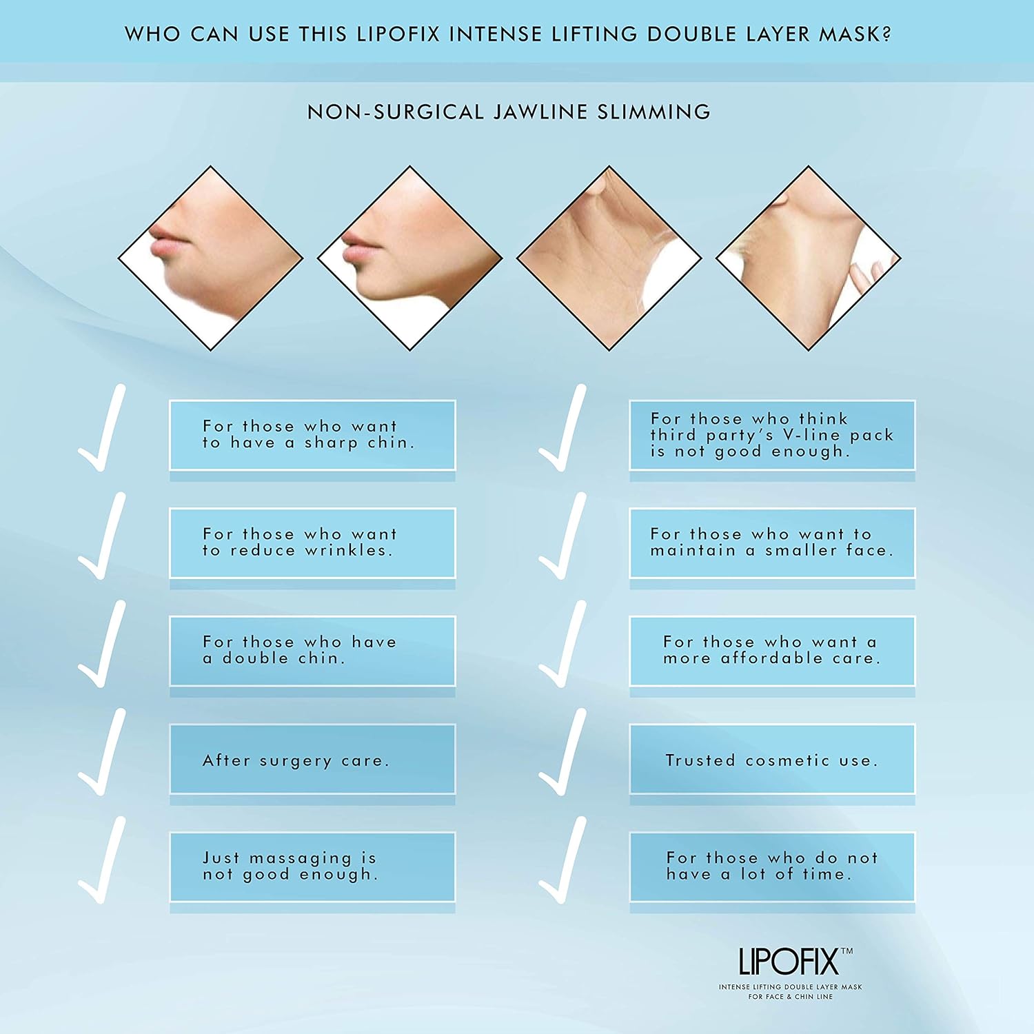 - Tightens skin gradually and improves the appearance of neck lines and cleavage creases