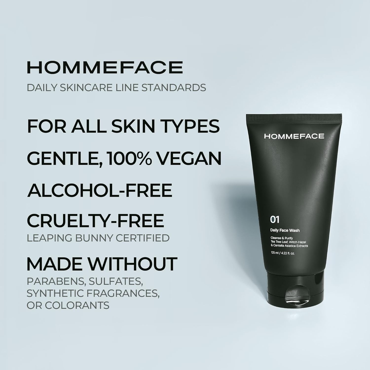 HommeFace Daily Face Wash for Men, 4.22 Fl. Oz. Gentle Facial Cleanser for Deep Cleansing & Purifying with Collagen, Witch Hazel & Cica Extracts, Vegan