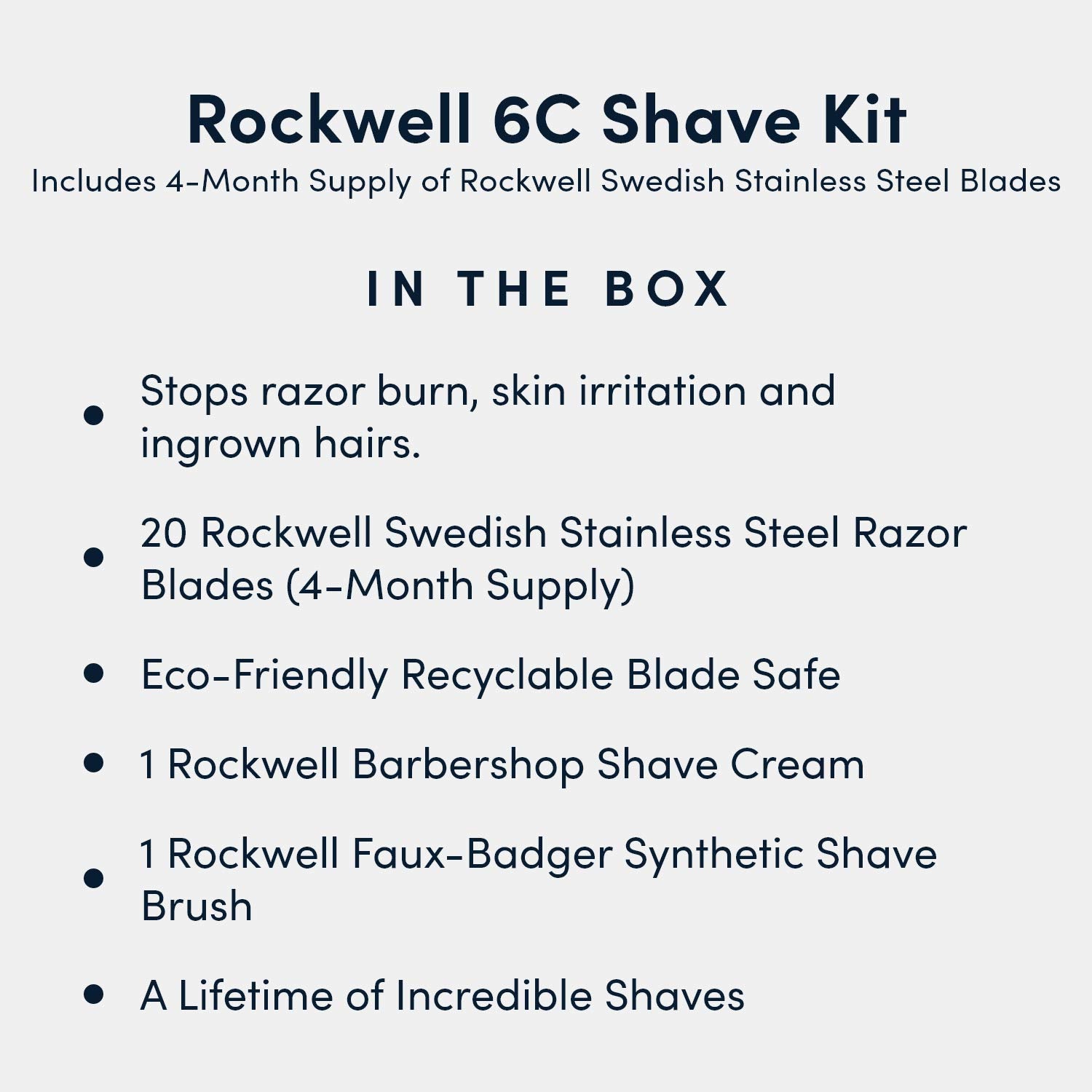 - KIT INCLUDES: 6C White Chrome Rockwell Razor, Barbershop Shave Cream, Faux-Badger Shave Brush and 5 Pure Swedish Stainless Steel Blades