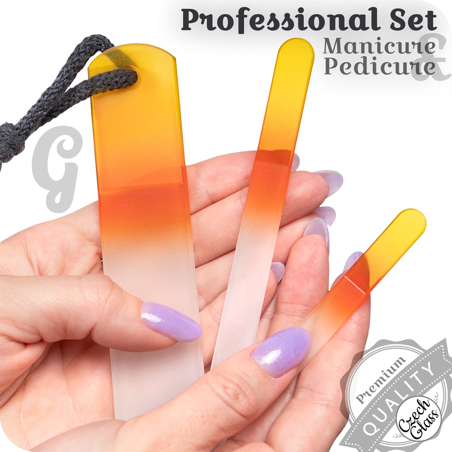 - Complete Nail & Foot Care Set – 3 pcs Czech glass tools: mini nail file for precise touch-ups, medium nail file for shaping natural nails, and a glass foot file callus remover (hard skin & cracked heels). Compact manicure and pedicure kit for home.