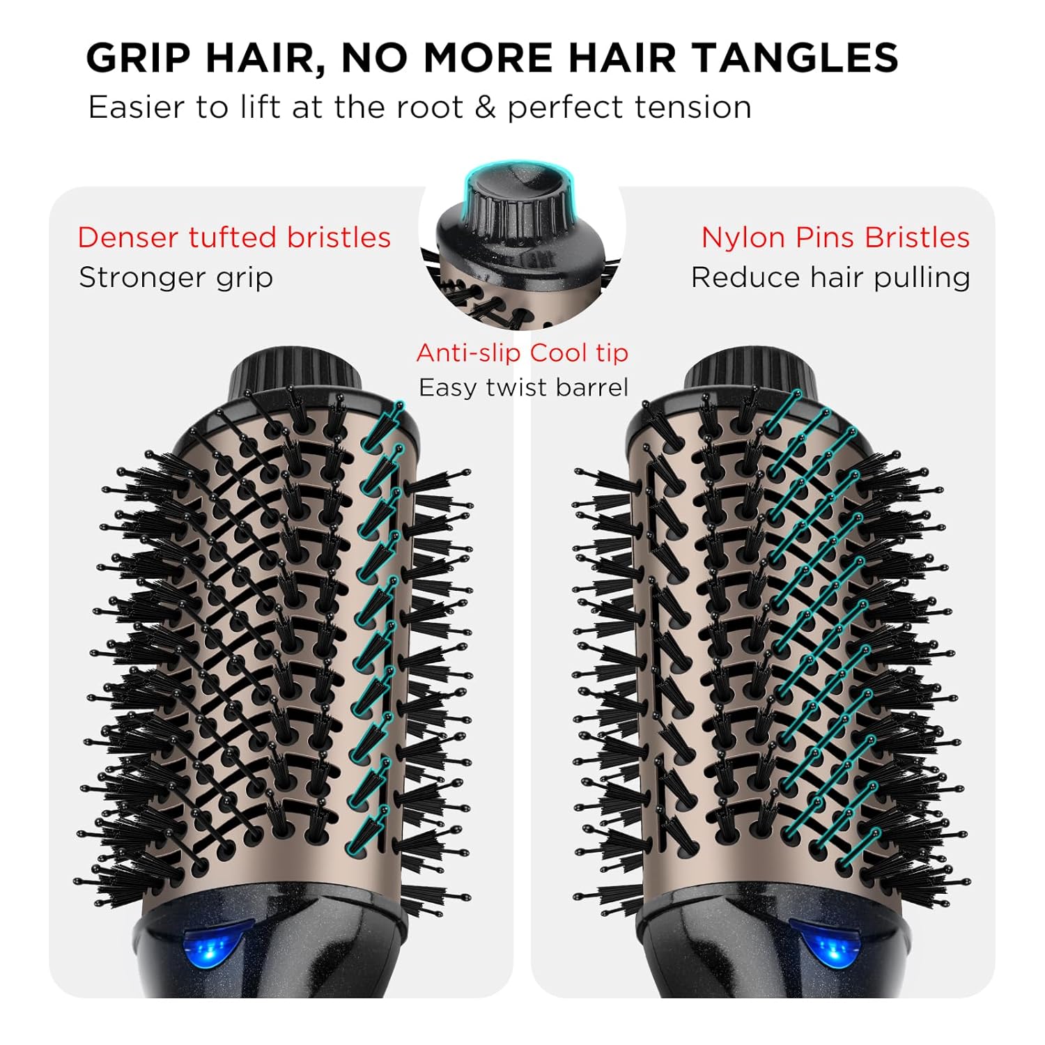 - 【Professional 4 In 1 Function】: In addition to hairdryer and curler brush, our oval brush hair dryer also straightener and brush. Suitable for all ages and hair types, like long hair, curls. Besides, one step hair dryer & styler is designed with Nylon Pin & Tufted Bristles for easy detangle & better grip of your hair. The ergonomic handle is designed for maximum comfort and ease of use during styling.