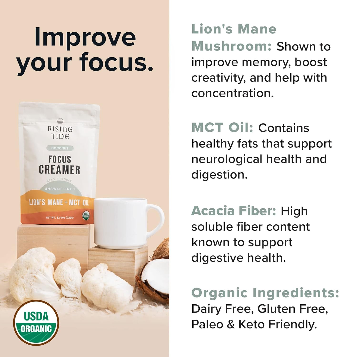 - ✔︎ WHAT IS FOCUS CREAMER?A powerful dairy free coffee creamer that features a blend of brain boosting ingredients including Lions Mane Mushroom and MCT Oil Organic; Improve your focus and achieve more every day with a simple addition to your cup of coffee; This non dairy creamer is a paleo & keto friendly creamer that is vegan and nondairy