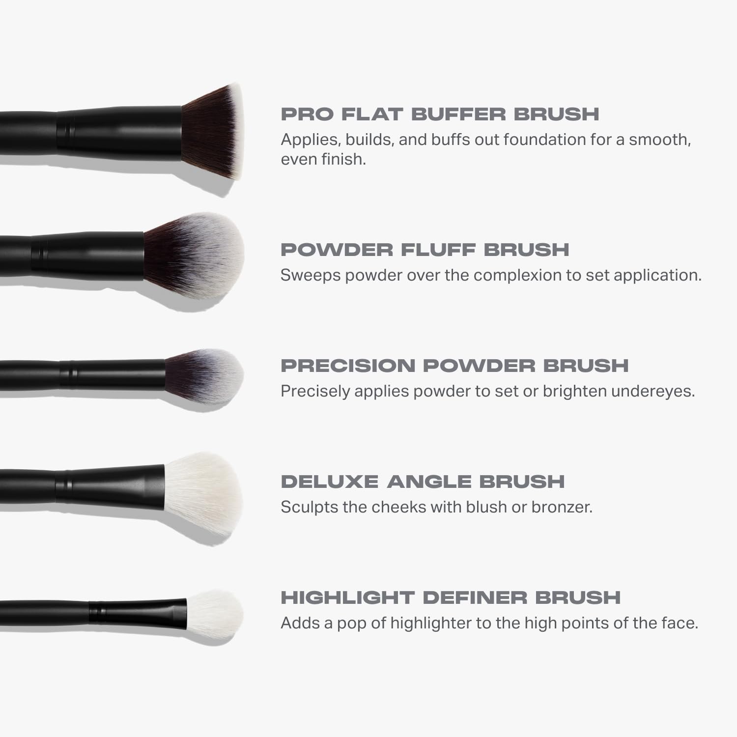 - Collection Includes - Our Pro Flat Buffer Brush (synthetic), a dense buffer brush that goes all out with smooth, even foundation application. Our Powder Bluff Brush (synthetic), a pointed powder brush for a clean sweep wherever you need it. Our Precision Powder Brush (synthetic), a pointed brush for crazy-good finish and a flawless blend.