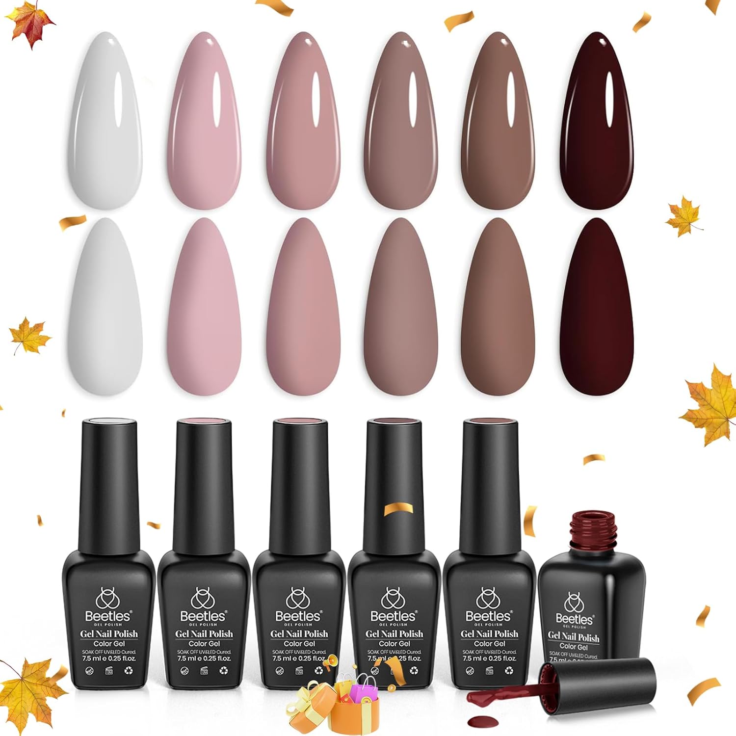 - Beetles Gel Nail Polish Set: 6*7.5ml/0.25fl.oz gel nail polish set, A blend of mauve, beige shades, and latte makeup for a neutral look that’s perfect for popular look! Color numbers are: e443-e444-e445-e446-e447-e448.
