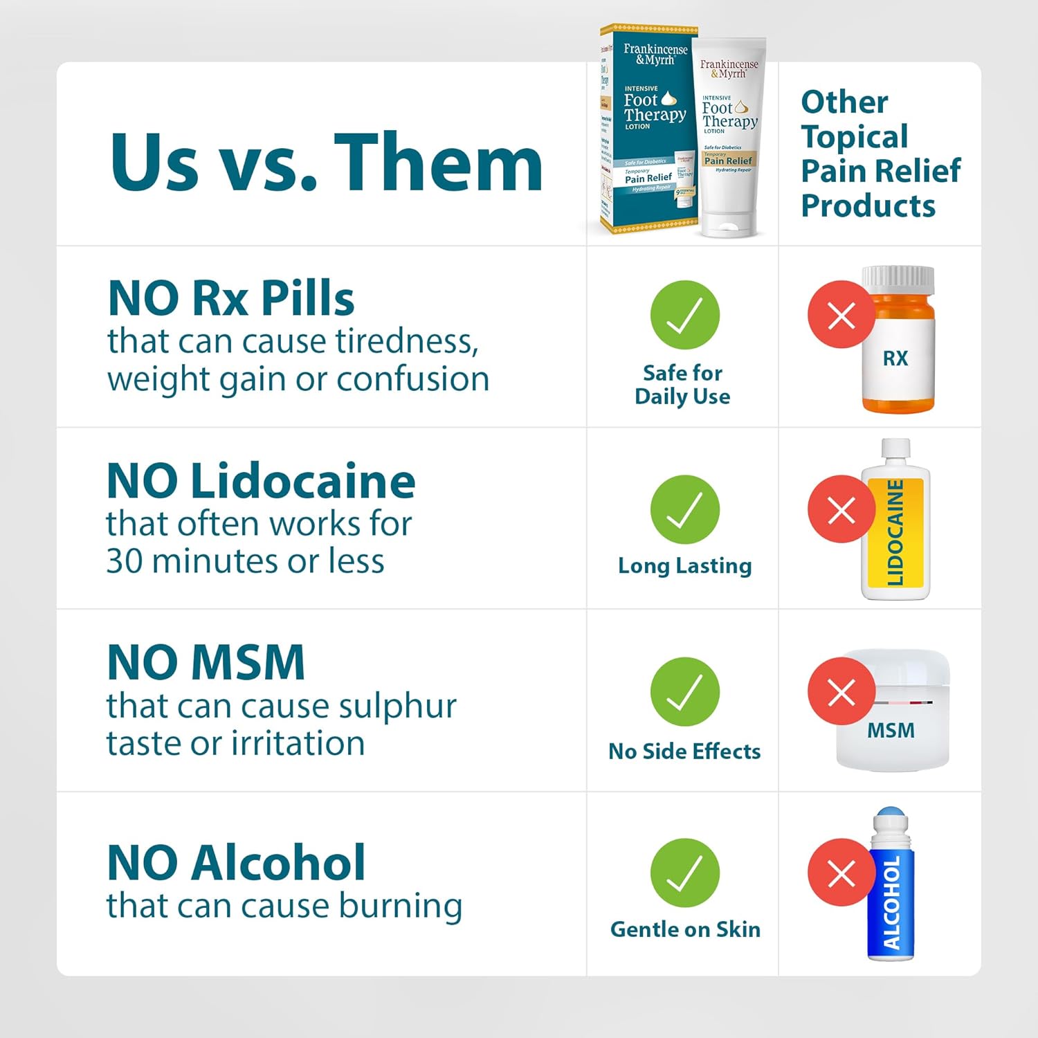 - Frankincense & Myrrh Intensive Foot Therapy lotion is a dual action pain relief and skin repair cream for painful feet with dry, rough skin. The safe, gentle formula with no side effects or adverse drug interactions is blended in an FDA registered facility in the United States. Does not cure neuropathy, but helps treat symptoms.