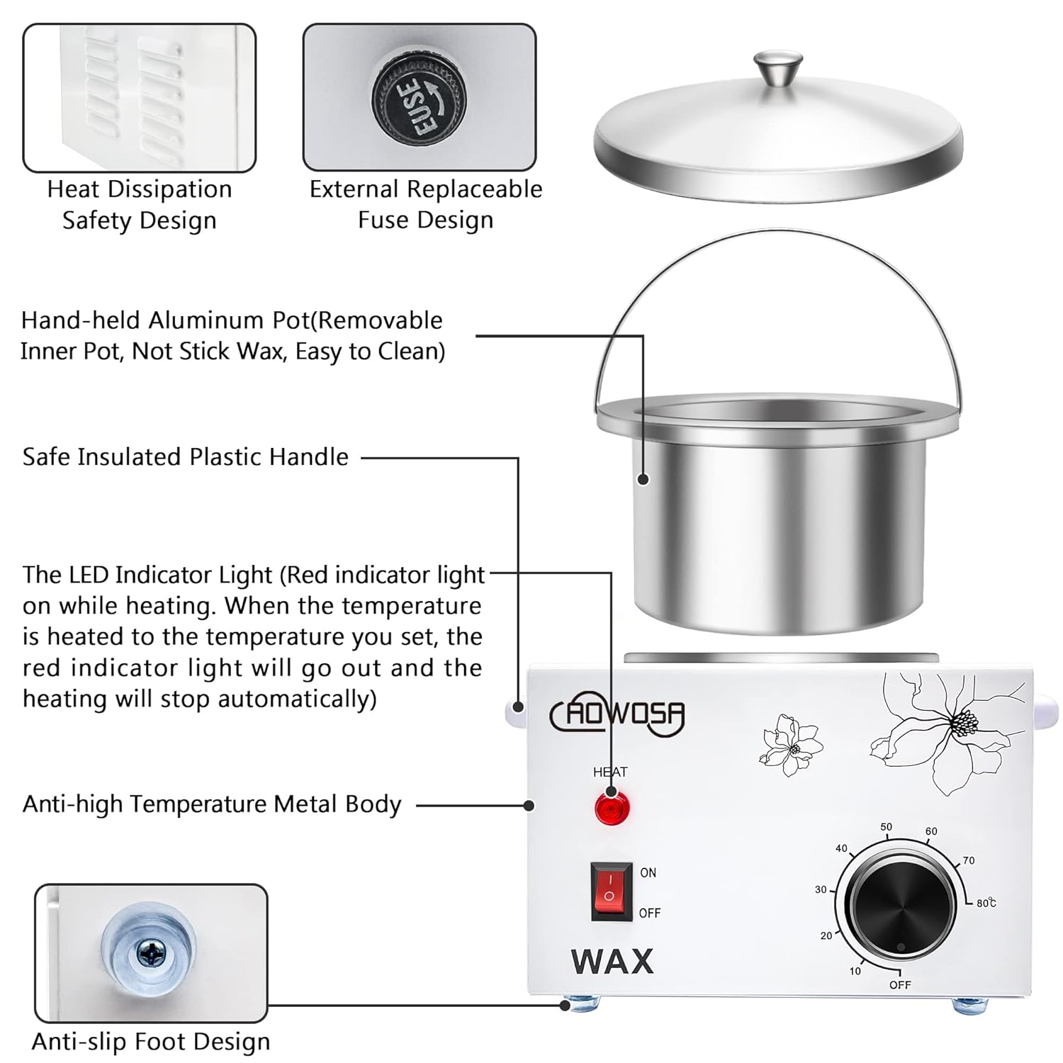- 【Premium Material】AOWOSA professional single wax pot heater is made of stainless steel metal construction body and aluminum pot. strong and sturdy, Heats up fast. Brings great convenience to waxing work, very suitable for home, beauty salon, spa, barber shop, etc.
