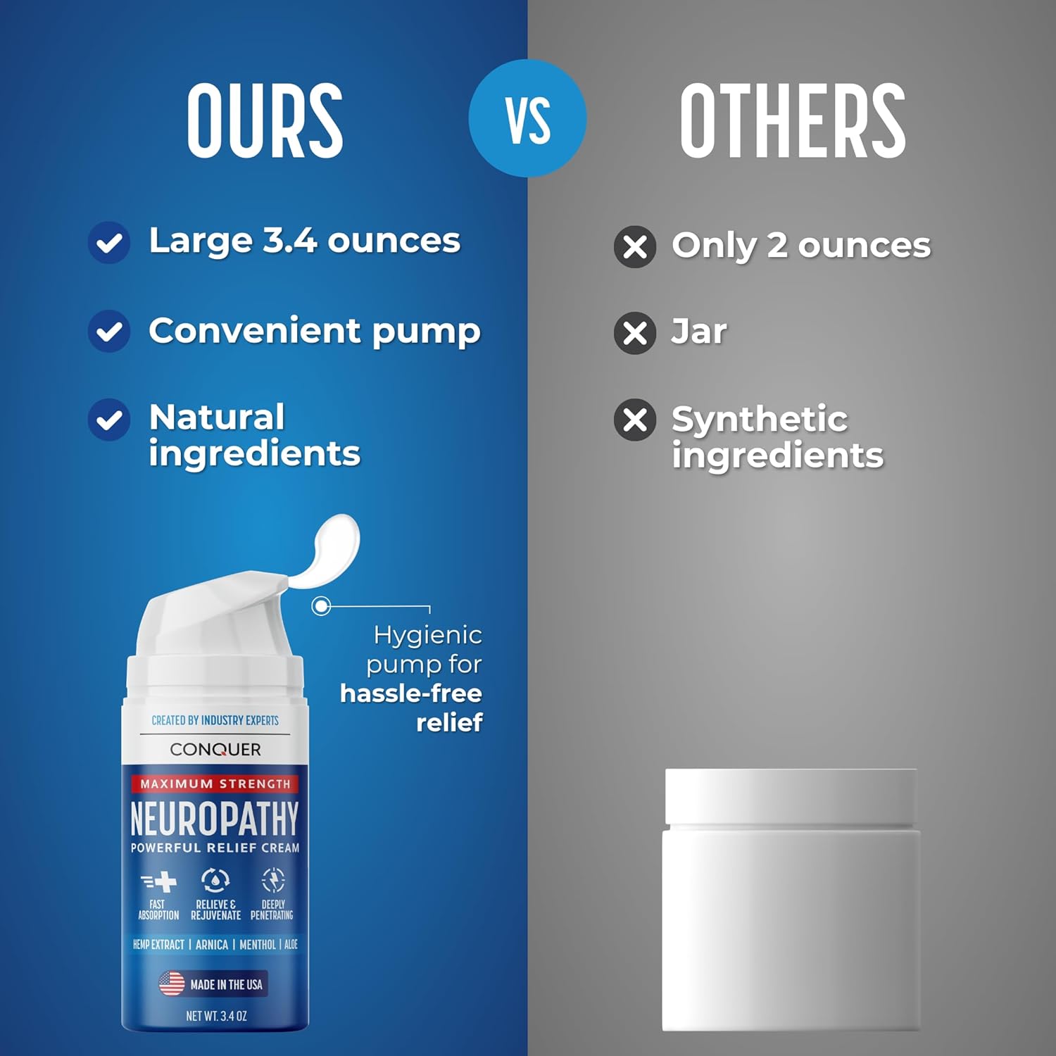 - [CHOOSE HIGH-QUALITY INGREDIENTS]: Conquer Neuropathy Relief Cream uses premium, non-GMO ingredients like arnica, aloe vera, and hemp, made right here in the USA. Free from artificial dyes and fragrances, it’s crafted for safe and effective natural nerve pain relief.