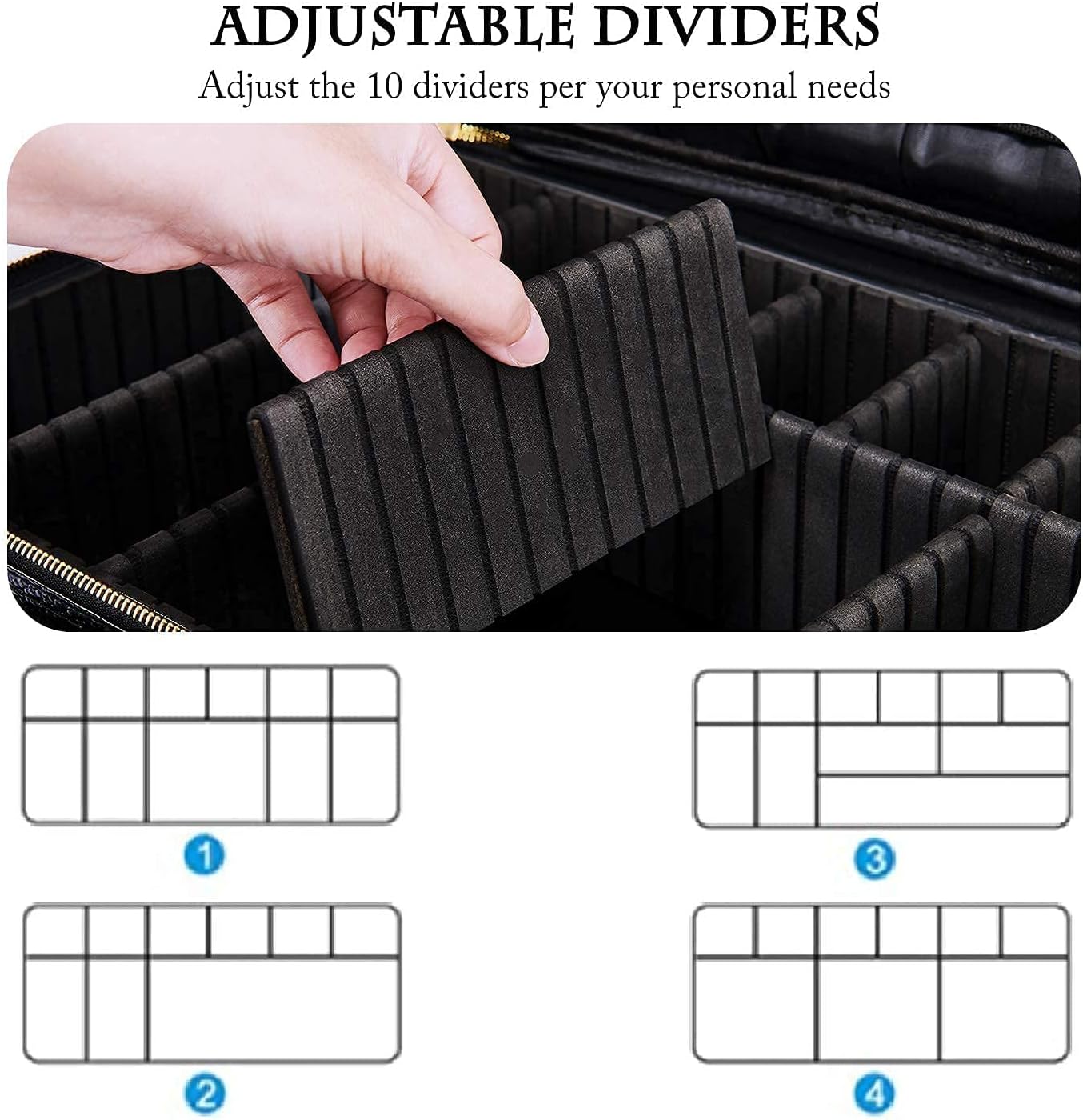 - Customizable Compartments:This makeup travel case has 10 removable dividers and 12 makeup brushes slots. You can design the internal compartments by adjusting the dividers to fit different cosmetics and keep them perfectly separated and organized.