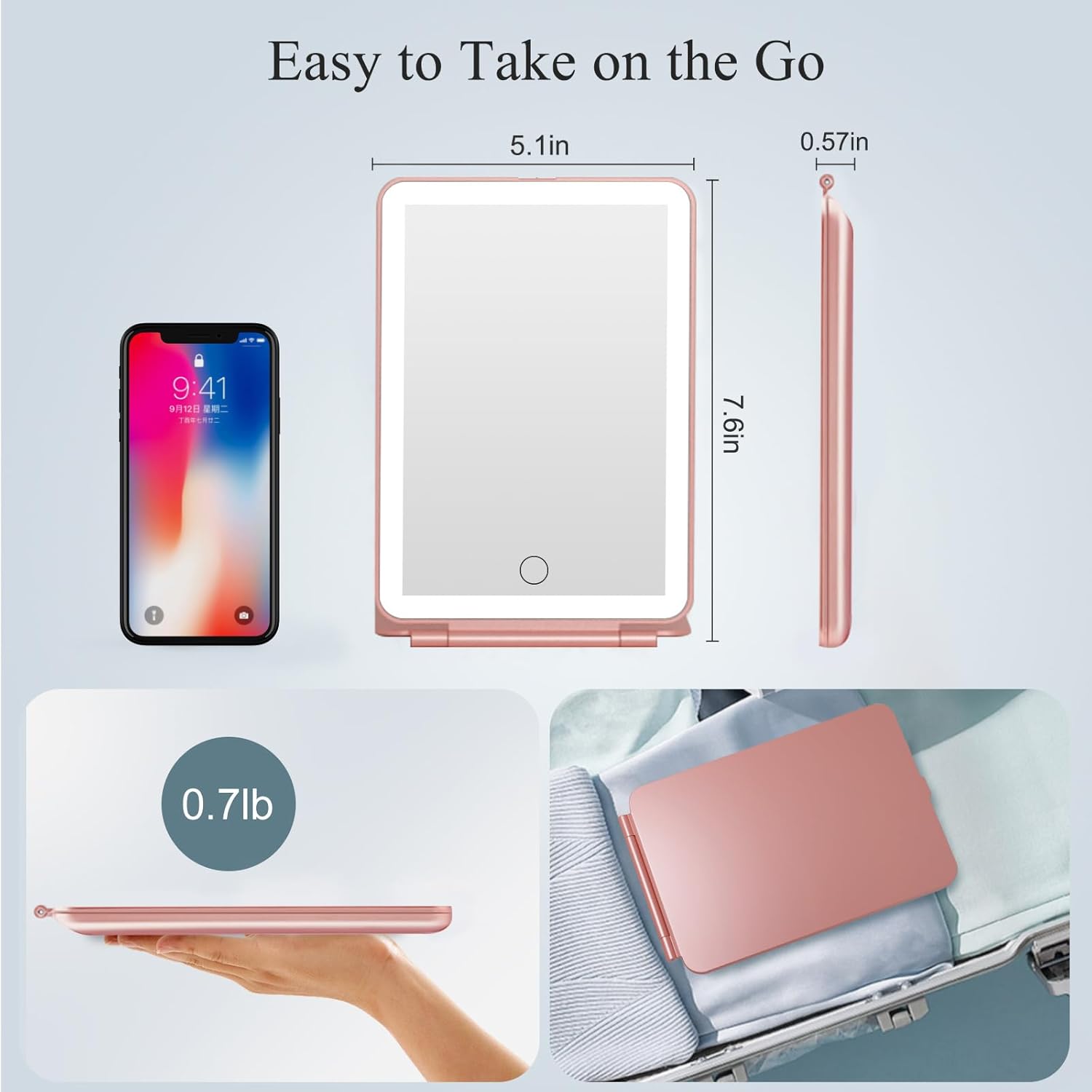 - 3.【Travel Size Lighted Makeup Mirror】 This rechargeable travel mirror with lights is Ipad Mini Size.The slim, lightweight and compact design makes the Eclipse your new travel buddy. Whether you’re in a hotel, train, university or at home this mirror makes it easy for slipping into your overnight bag ready to take on whatever the new day brings.