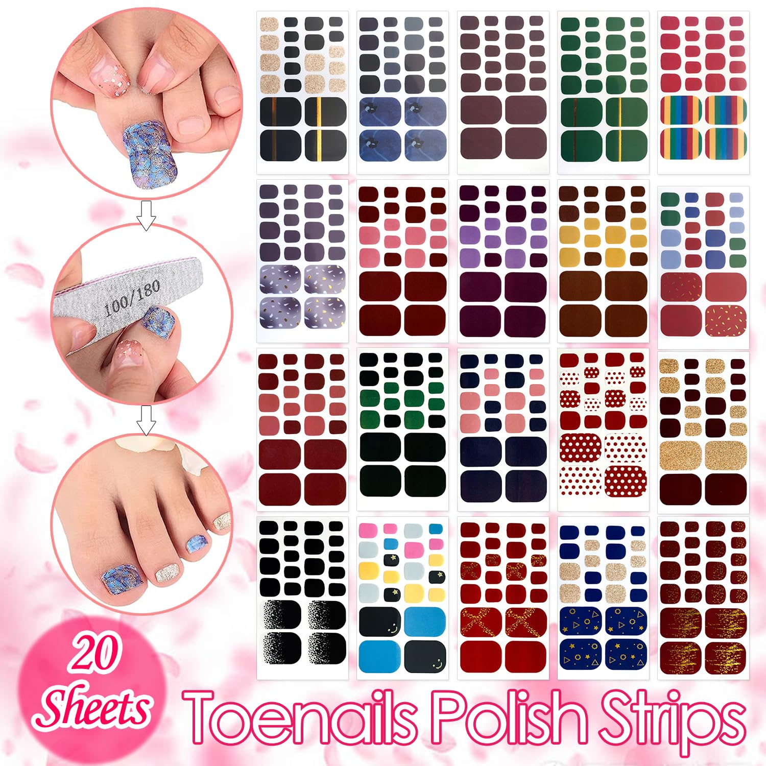 - PERFECT PACKAGE - 1×20 sheets adhesive toenail art decals (glitter, gradient, rainbow) + 1pc nail file (When you receive it, you can immediately design you nail )