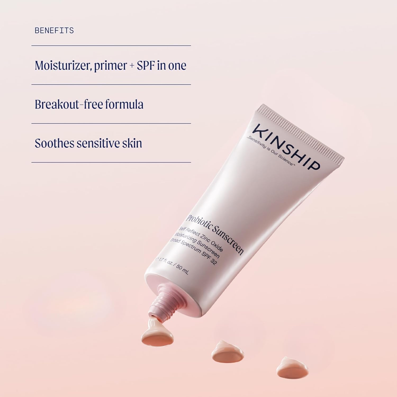• NOURISH + PROTECT - Beyond sun protection, Kinship Self Reflect SPF 32 is infused with turmeric and Kinbiome, our patented plant-based pre-probiotic technology. These powerhouse ingredients work together to soothe and nourish your skin, strengthen the skin barrier, and support a clear, glowing complexion, making this sunscreen a vital part of your skincare routine every day of the year.