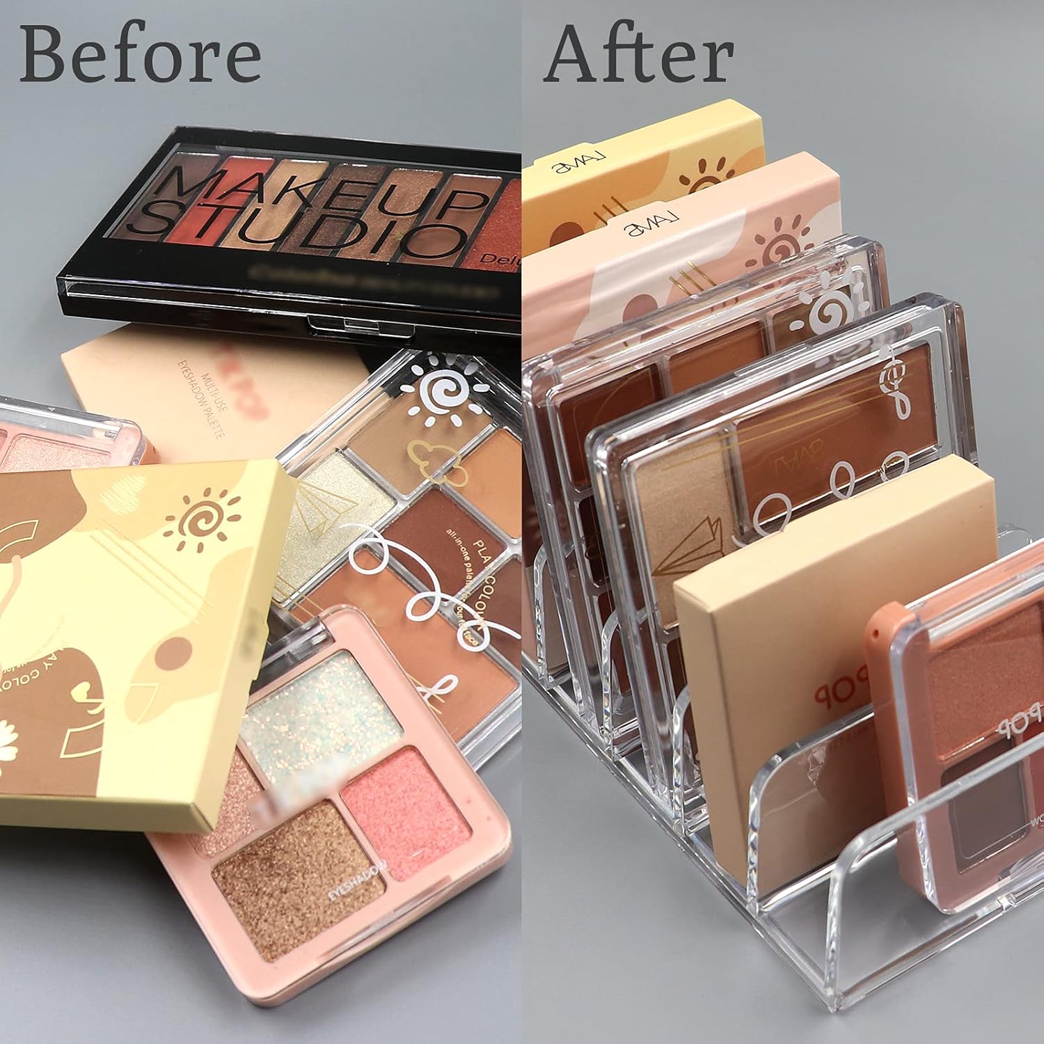 - 【Sits Vertically Or Horizontally】Made for makeup lovers, makeup artists and teenagers, this functional makeup pallet organizer is a great addition to any vanity or bathroom countertops. Designed to stand upright on your counter or lay flat inside your makeup drawer, leaving a smaller footprint.