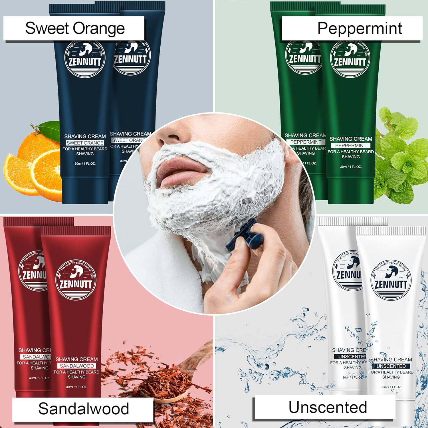 - Shave Beard is No Longer Annoying:After rinsing face,the shaving cream will leave your skin refreshed and soothed and makes for a more comfortable shave.The shaving kit for men includes 4 Scented creams.The light citrus smell is pleasant,the Sandalwood smells manly,the Mint creates a cooling sensation and the unscent one will not be competing with your cologne or other strong perfume.All of them are included in the gift box.Absolutely the tip-top shaving lotions set in your shave kit.