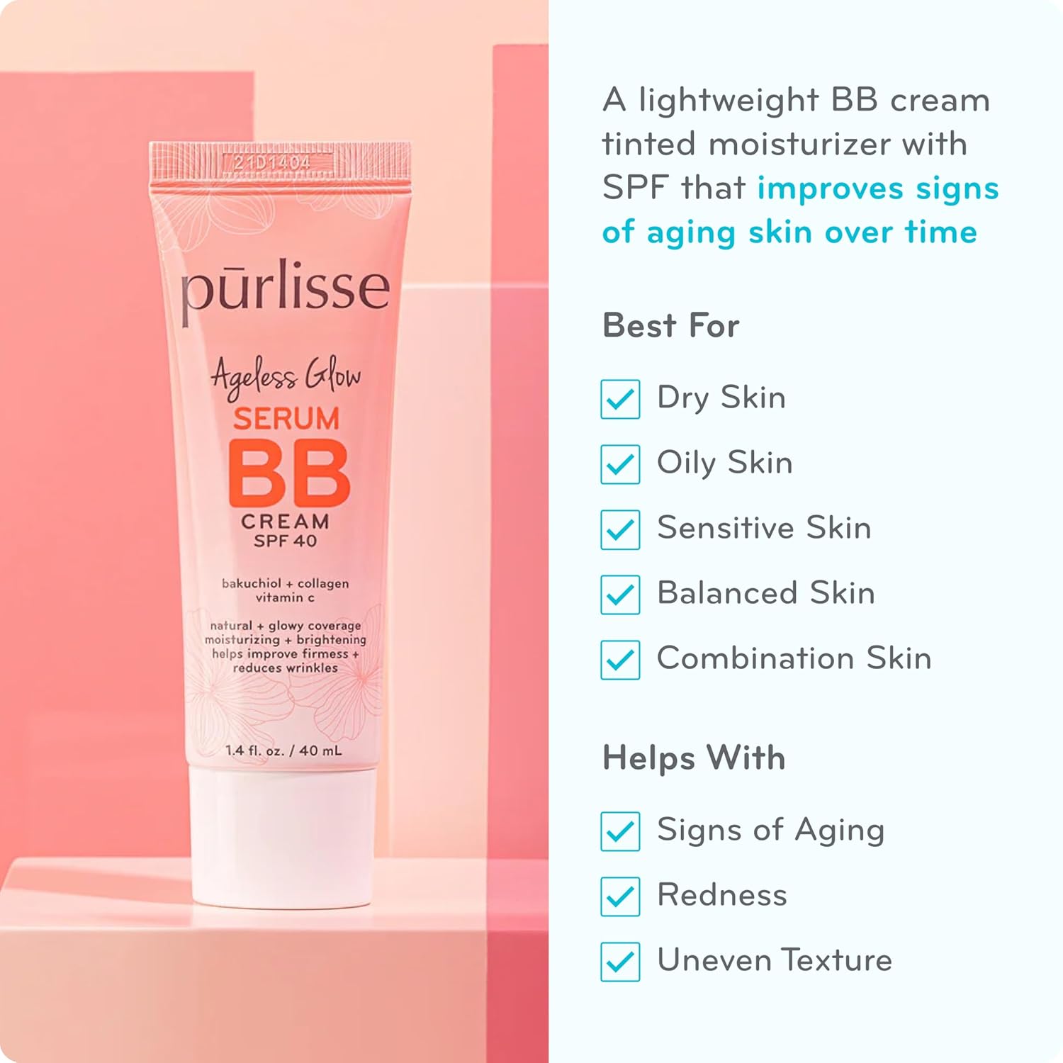 pūrlisse Ageless Glow Serum BB Cream SPF 40 - Glow BB Cream with SPF Enriched with Bakuchiol & Vitamin C to Help Improve Firmness & Reduce Wrinkles for Dewy Skin - Light (1.4 oz)