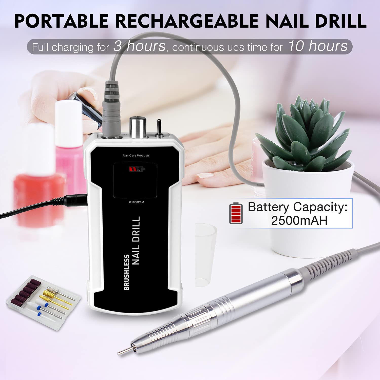- 【Portable and Rechargeable E-File Nail Drills】Designed with a high-quality aluminum alloy handpiece, it is lightweight and portable. Belt hook design of the body case makes it easy to install or disassemble, you can hang it on your waist. No need to be plugged in the outlet under operation. Only be charged for about 3 hours, the electric nail drill lasts 8-10 hours operation time.