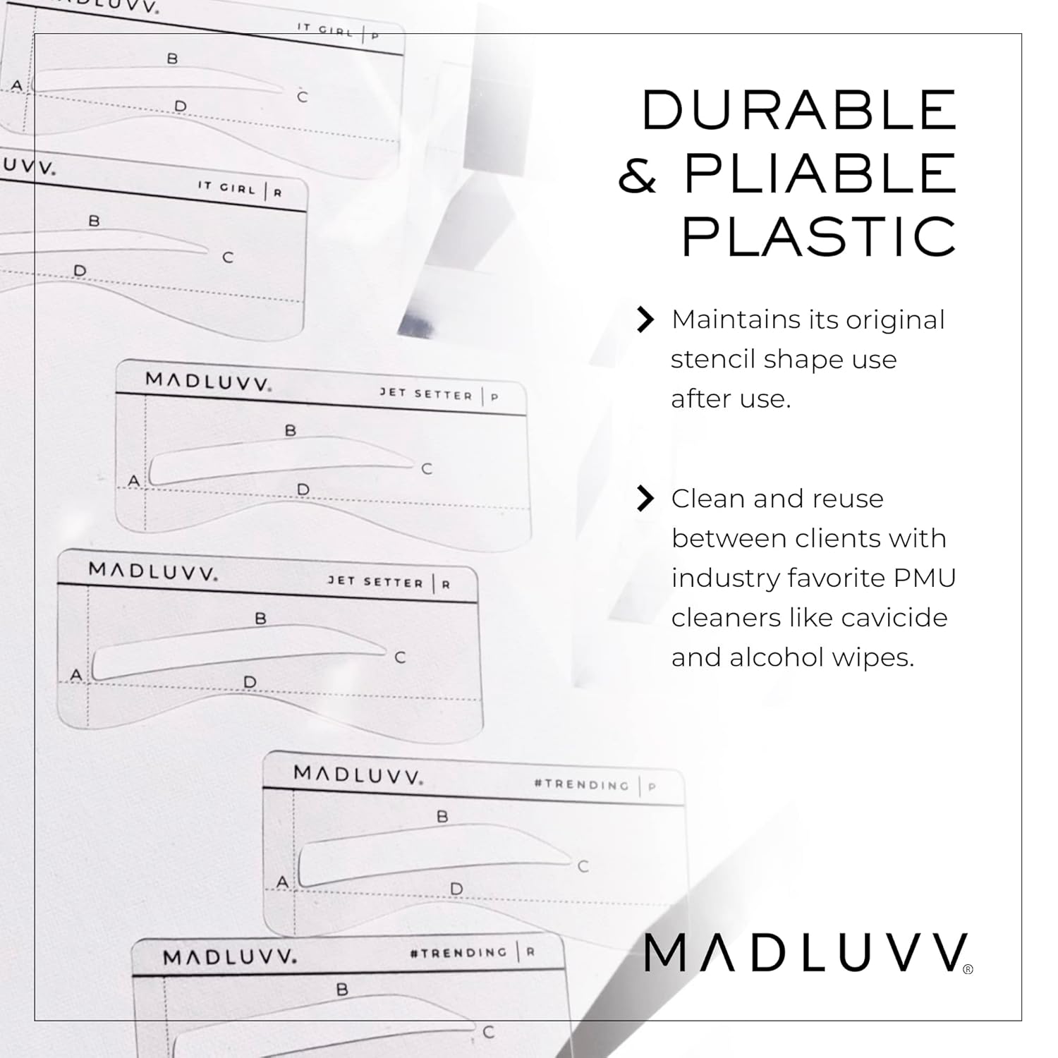 - Improvements You’ll Luvv: New, stronger plastic eyebrow stencil material maintains its shape for more uses than before while remaining pliable for every application; stencils stand up to industry favorite PMU cleaners like cavicide and alcohol wipes