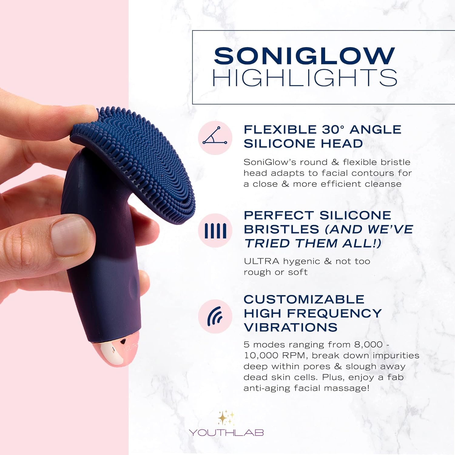 SoniGlow Silicone Facial Cleansing Brush – Electric Vibrating Skincare Scrubber Tool for Deep Pore Cleansing, Gentle Massage, Makeup Removal, Waterproof and Rechargeable (Navy)