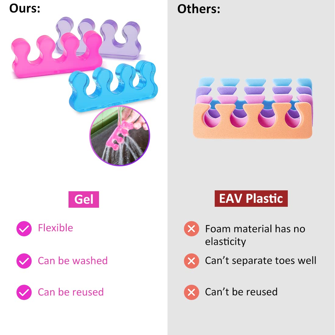 - 👏【Reusable,easy to clean】Toe Separators for Pedicure can be cleaned repeatedly,and jelly material that can be used multiple times is not easy to deform.Upgraded version of Foam pedicure toe separator.Rinse once with water before use.【Warranty】:We love our customers,If you are troubled by product problems,please contact us as soon as possible to solve it for you,including return or exchange.