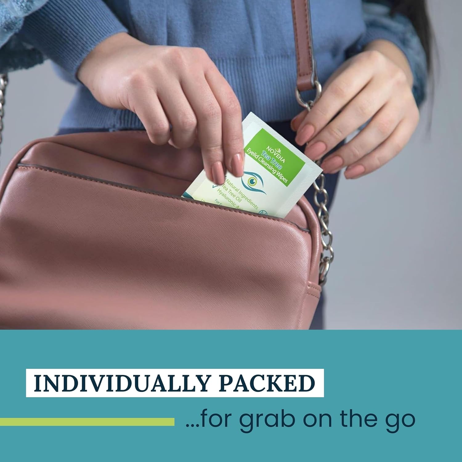 NOVEHA 180PCs Tea Tree Oil Eyelid & Lash Wipes With Hyaluronic Acid, Green Tea & Chamomile For Blepharitis & Itchy Eyes, Individually Wrapped Eyelash Wipes Natural Makeup Remover & Daily Cleanser