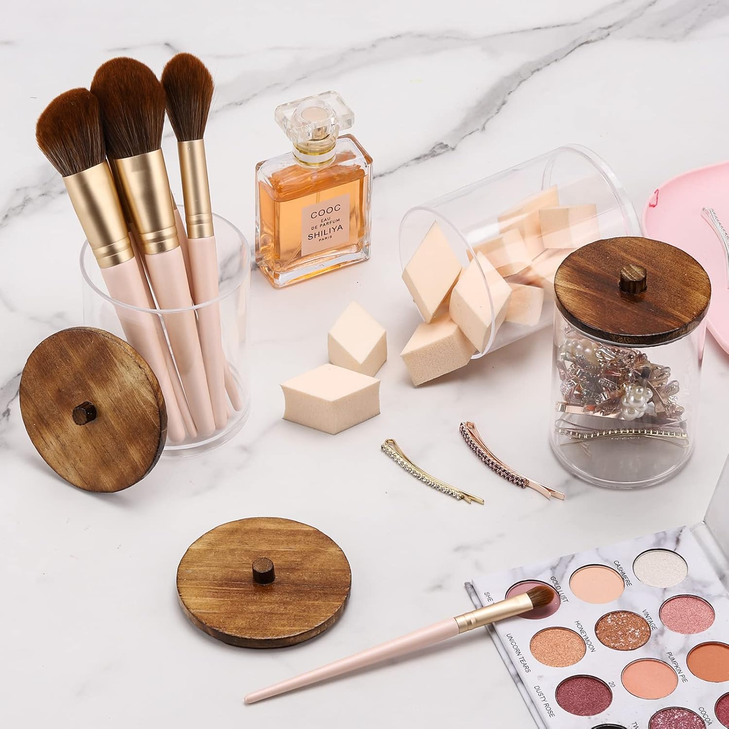 - Q tip Storage Organizer - Look like glass but are a really sturdy plastic and will not shatter, safe for kids