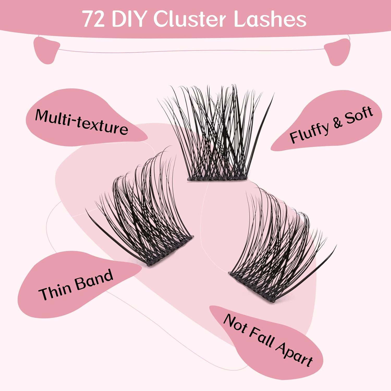 Cluster Lashes 72 Pcs Lash Clusters DIY Eyelash Extension Individual Lashes D-8-16 mix Thin Band Easy to Apply at home Lashes (First Glance, D-8-16 mix)