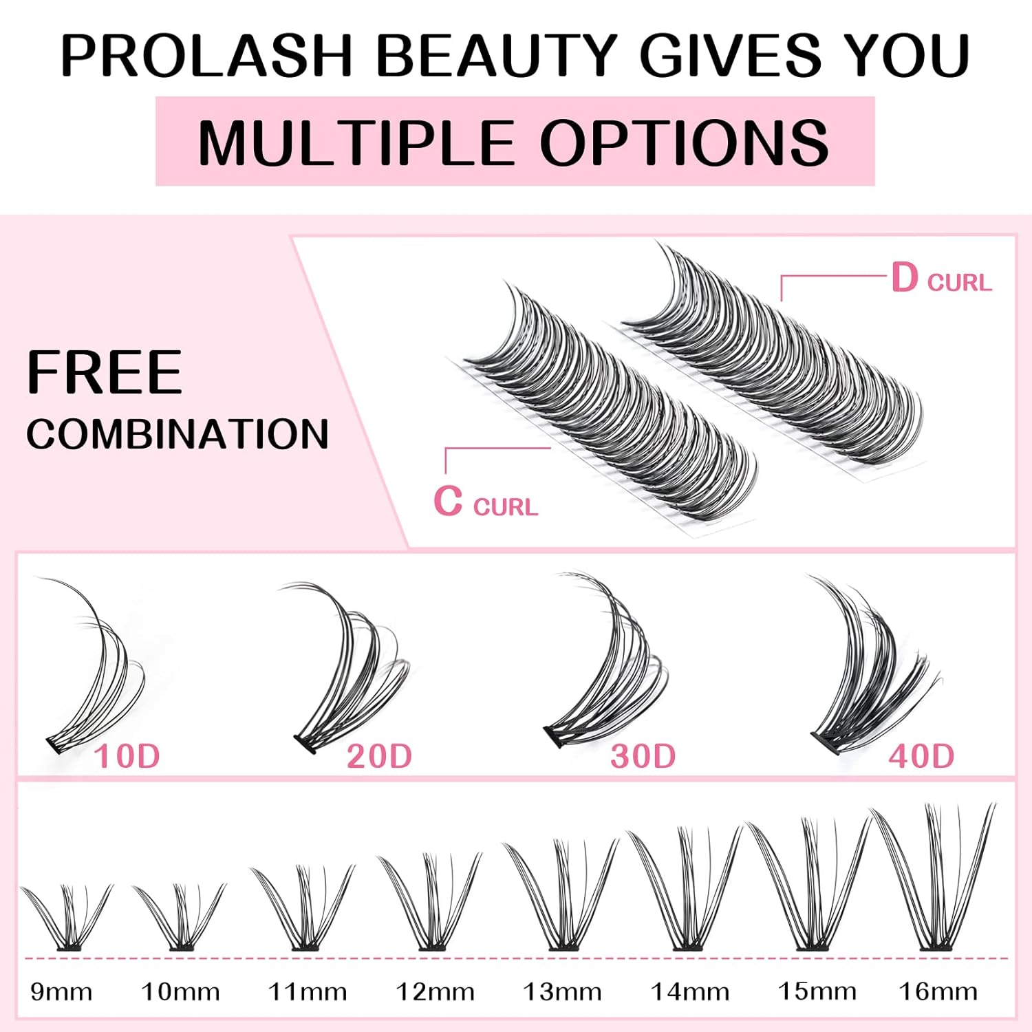 - Unique: The now very popular individual lashes are now available in PRO LashBeauty, and it is especially worth highlighting that PRO LashBeauty can provide 280 lashes in one tray! The blended lengths range from 9mm to 16mm, curls include C and D, and there are also have 10D, 20D, 30D, 40D, 10D+20D, 30D+40D. With a variety of styles for you to choose from. For the same price, you get more lashes and more uses.