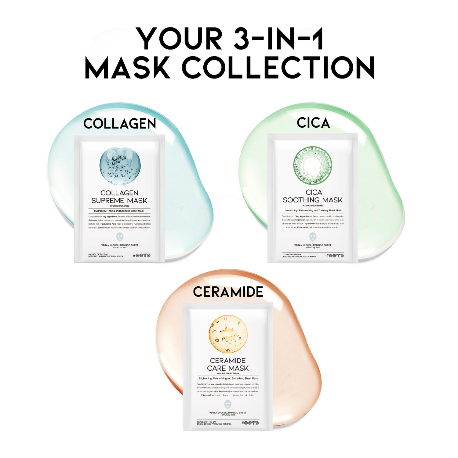 • CLINICALLY PROVEN TO WORK - All #OOTD products are clinically tested to prove its efficacy. COLLAGEN SUPREME MASK confirmed to hydrate, increase skin elasticity and optimize pH value of the skin. CERAMIDE CARE MASK to hydrate, increase skin elasticity, brighten the skin and optimize its pH value. CICA SOOTHING MASK confirmed to hydrate and increase skin elasticity.