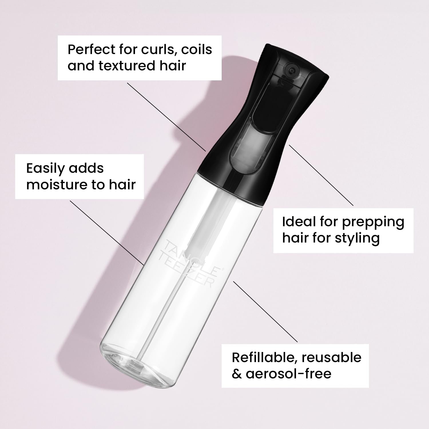 TANGLE TEEZER Fine Mist Spray Bottle, Continuous Mist for Detangling and Hairstyling, 10.1 oz, Black