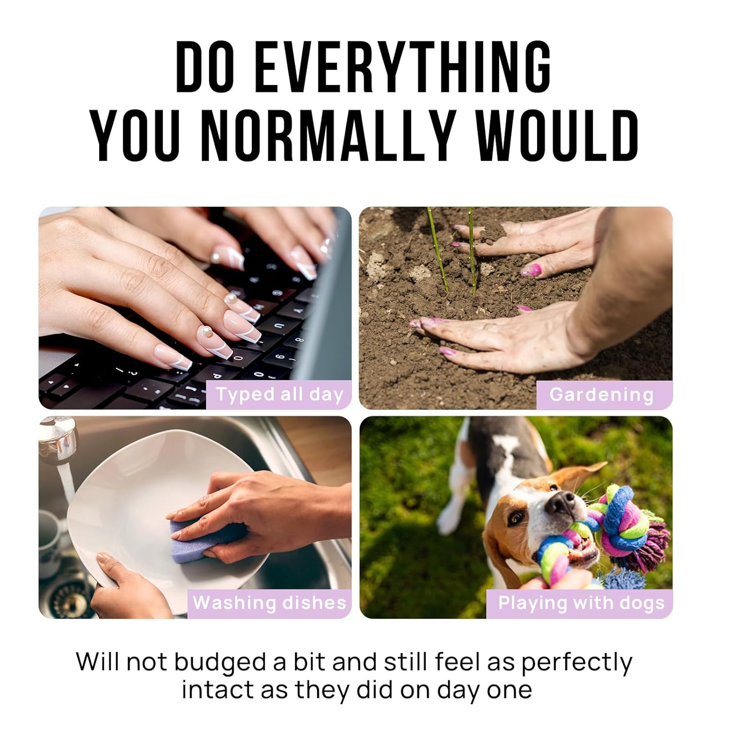 - Do Everything You Normally Would: All BTArtbox stick on nails offer feature protective building gel finish so that you are able to do everything you normally would, such as typing, gardening, houseworking or playing with your pet. They will not budged a bit and still feel as perfectly intact as they did on day one