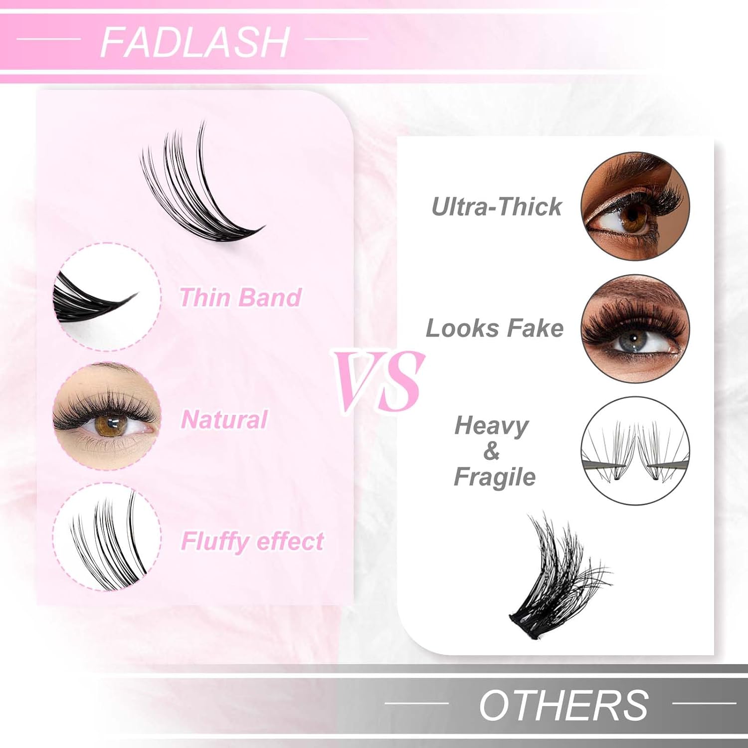 - 【Suitable to wear】:Gently dab the cluster lash glue on your natural lashes or on the cluster lash band, and then apply the cluster lashes in the way you like. If needed, brush a thin layer of sealer for reinforcement. The bottom of the clusters is flat and hardly noticeable.The lash band part will not stab your eyelid area when you blink.