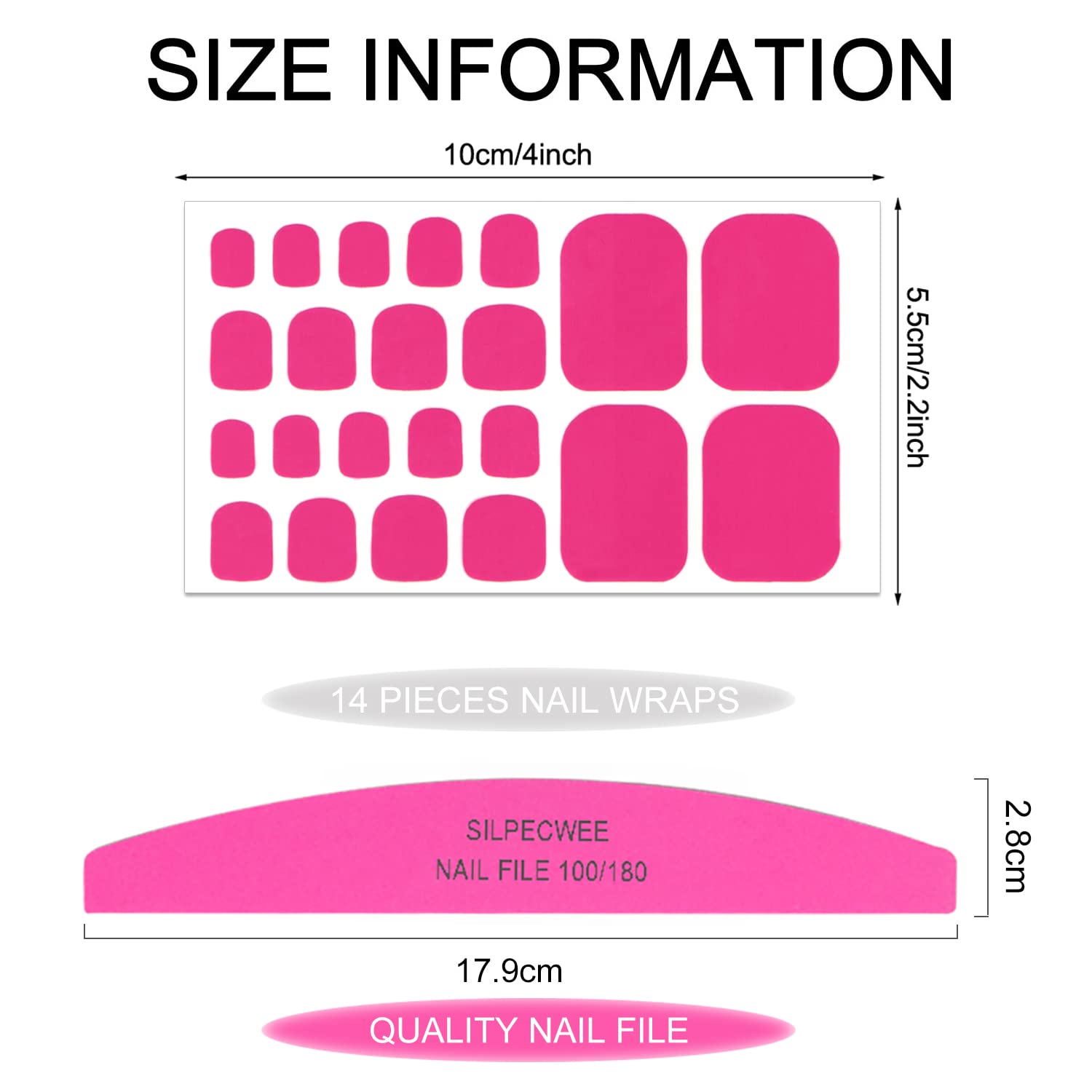 - Package Content - 20 sheets toe nail polish strips for women + 1pc nail file. each sheet of measures approx. 10 x 5.5 cm/ 4 x 2.2 inches, total 440 pieces and 11 different sizes, convenient to carry and store without taking up much space.