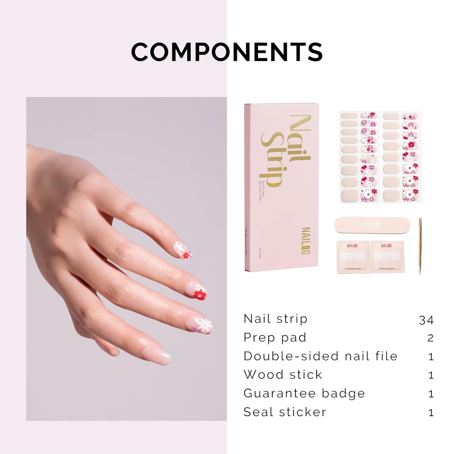 Nailog Semi Cured Gel Nail Strips 34 pcs | Long Lasting Nail Polish Sticker Wraps with Glossy Gel Finish (Florid)