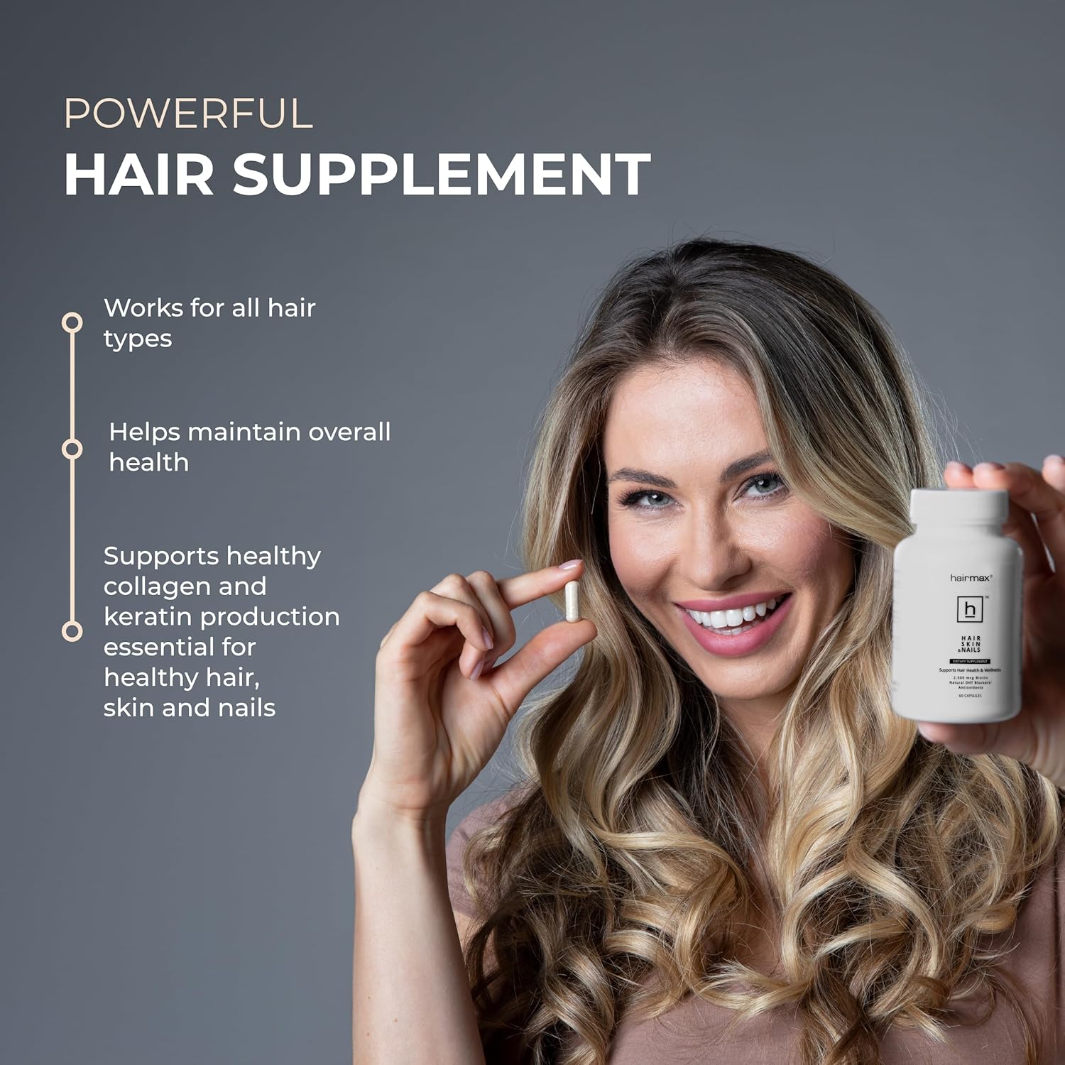 - Works for all hair types and helps maintain overall health. This hair supplement is suitable for anyone looking to support their hair’s health, offering comprehensive benefits for women supplements aimed at boosting hair strength and vitality, regardless of hair type.