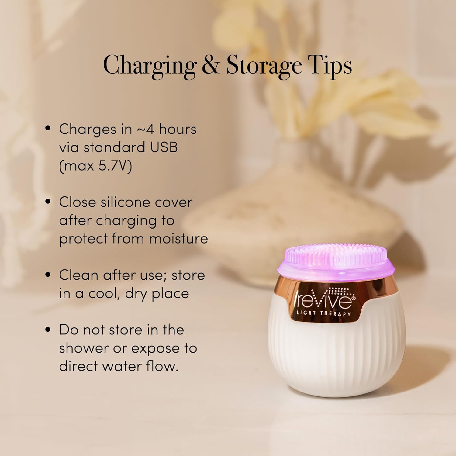 • Rechargeable LED Facial Light Therapy - This facial cleansing brush charges fully in ~4 hours via USB (5.7V max). Always seal the silicone cover before storing. Do not store these face tools for skincare in the shower.