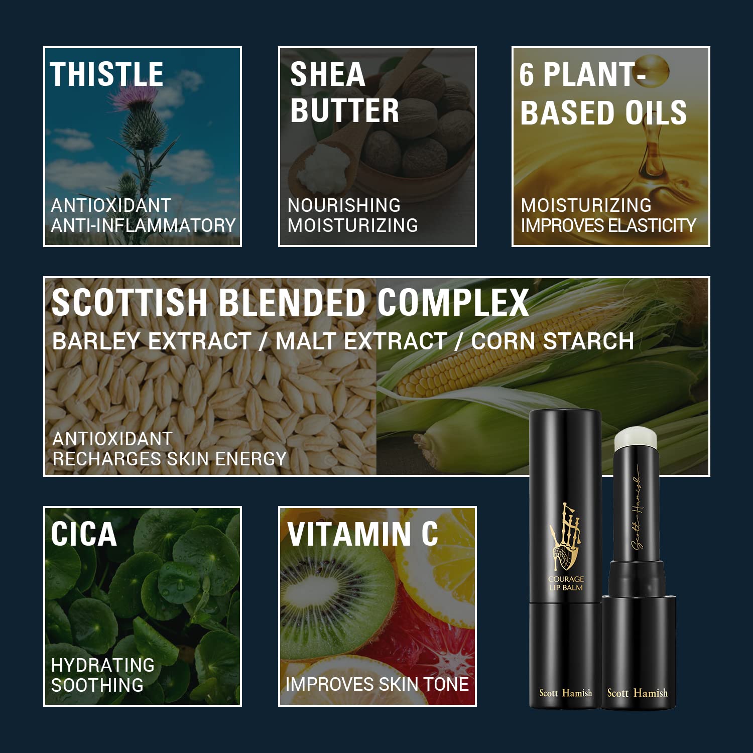 - SCOTTISH LIP BALM FOR MEN: Scott Hamish Courage Lip Balm contains Scottish Blended Complex, a blend of grain extracts containing barley, malt, and corn to replenish the lip with moisture. The Milk Thistle & Cica Extracts create a soft layer to protect the skin.