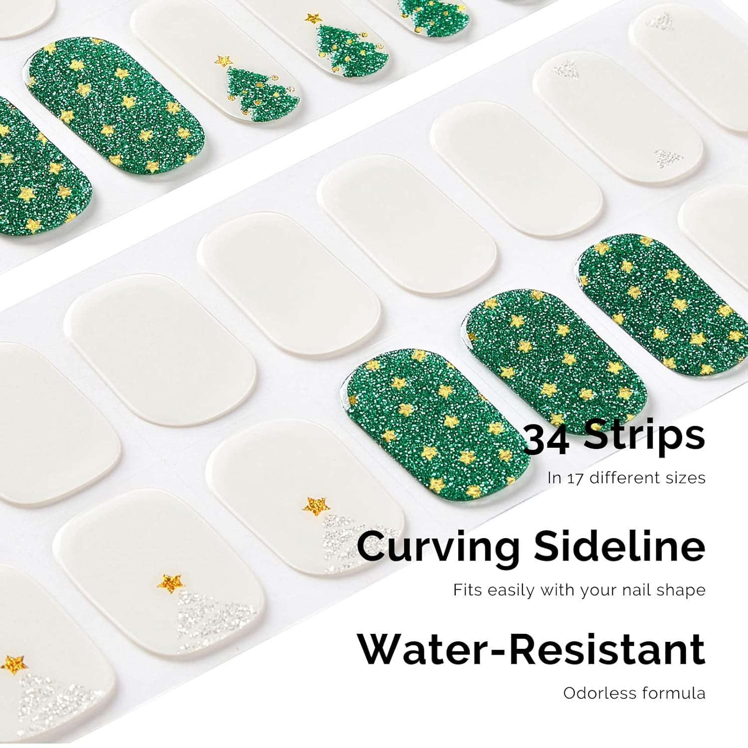 Nailog Semi Cured Gel Nail Strips 34 pcs| Long Lasting Nail Polish Sticker Wraps with Glossy Gel Finish, Twinkling Trees