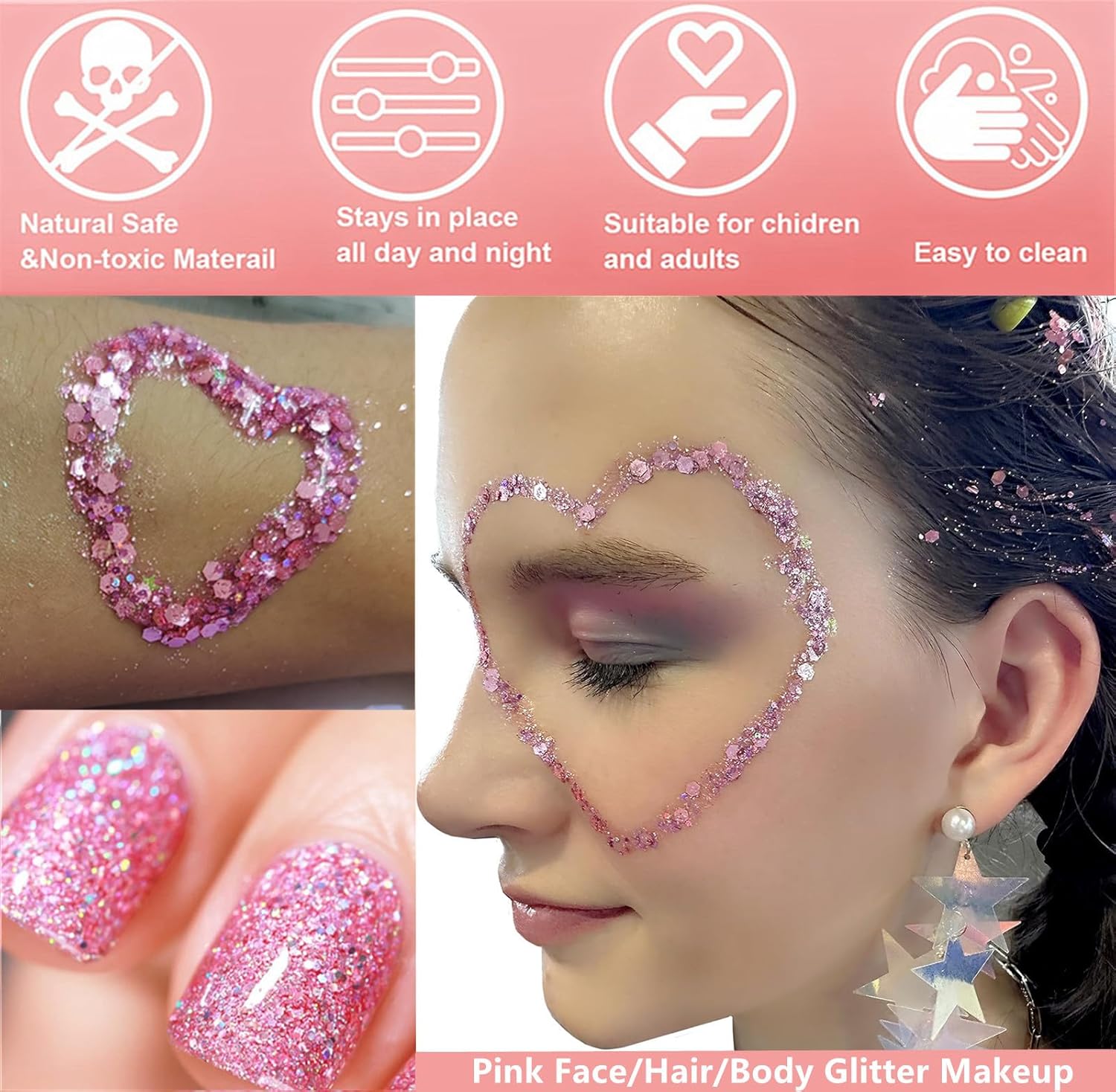 - 【Safe Ingredients】Made of natural and safe ingredints.Vegan,cruelty-free,hypoallergenic and never tested on animals.Non-irriated on skins.Pink eye black glitter makeup easily,make you shine and unique in the crowd.